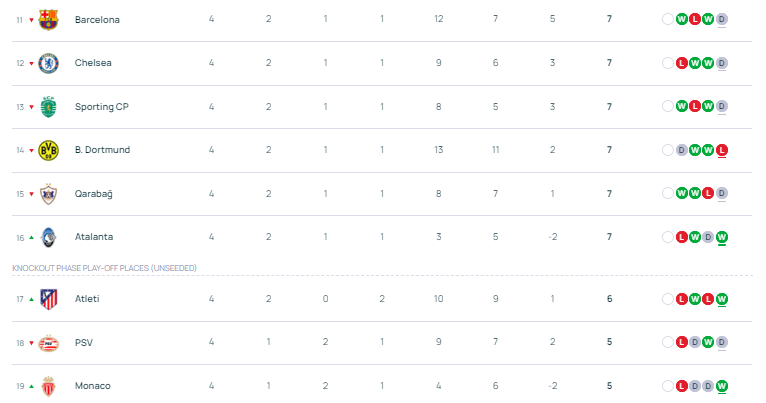 แมนเชสเตอร์ ซิตี้ อยู่ในอันดับที่สี่ด้วยชัยชนะสามครั้งและเสมอหนึ่งครั้ง ขณะที่ทีมที่มีชัยชนะสามครั้งและแพ้หนึ่งครั้ง ได้แก่ ปารีส แซงต์-แชร์กแมง, นิวคาสเซิล ยูไนเต็ด, เรอัล มาดริด, ลิเวอร์พูล และ กาลาตาซาราย