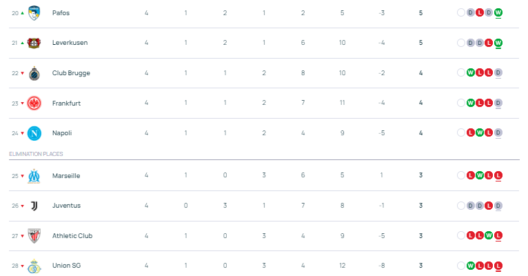 ขณะนี้ยังมีสามทีมที่ยังไม่แพ้ใคร ได้แก่ บาเยิร์น มิวนิค, อาร์เซนอล และ อินเตอร์ มิลาน ซึ่งครองสามอันดับแรกด้วยคะแนน 12 แต้มเท่ากัน บาเยิร์นและอาร์เซนอลต่างมีผลต่างประตูได้เสีย +11 แต่ยักษ์ใหญ่แห่งแคว้นบาวาเรียนำหน้าปืนใหญ่ด้วยจำนวนประตูที่ยิงได้มากกว่า (14-11) ขณะที่อินเตอร์ มิลาน อยู่อันดับสามด้วยผลต่างประตูได้เสีย +10
