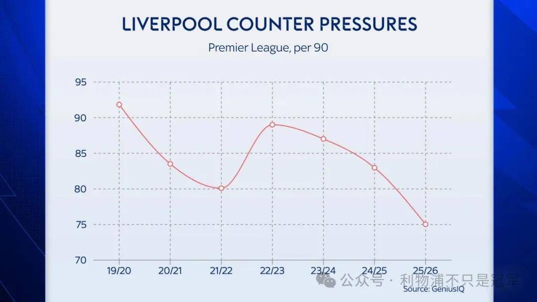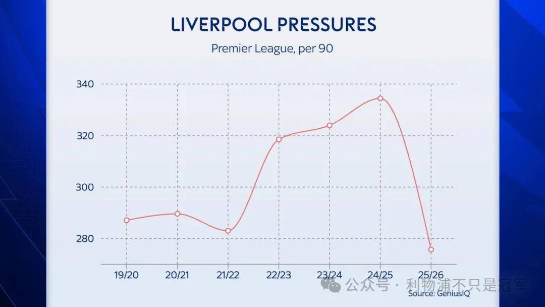 เมื่อหันมาดูการกดดันสูง ความถี่ในการกดดันของลิเวอร์พูลในฤดูกาลที่แล้วสูงกว่าห้าฤดูกาลก่อนหน้า แต่ในฤดูกาลนี้กลับลดลงสู่ระดับต่ำสุดในรอบเจ็ดฤดูกาลที่ผ่านมา