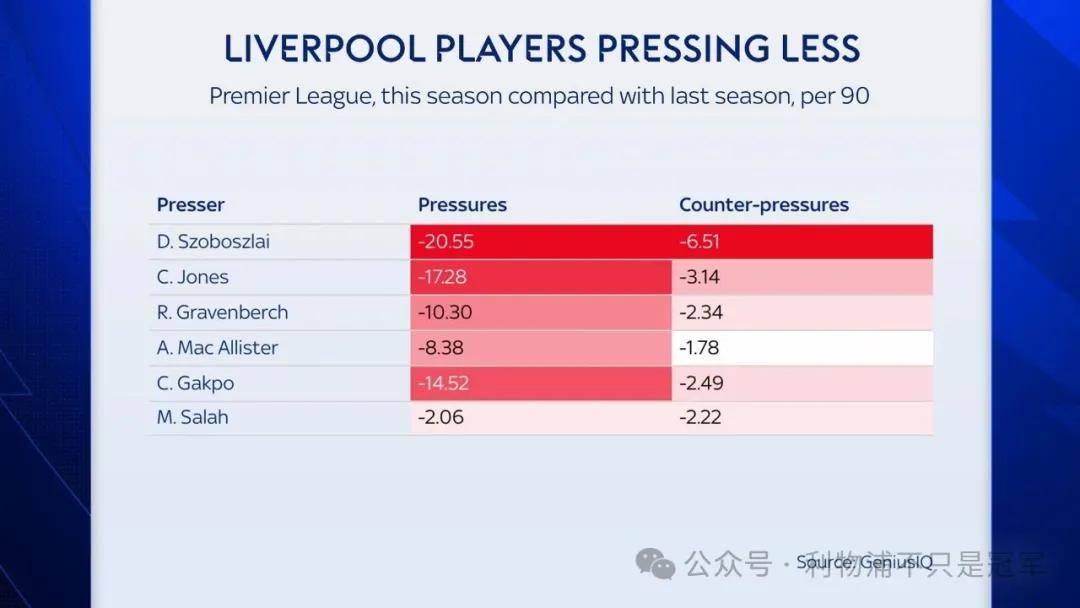เพื่อให้การกดดันมีประสิทธิภาพมากขึ้น จำเป็นต้องไม่เพียงแต่การประสานงานที่ราบรื่นระหว่างผู้เล่นเท่านั้น แต่ยังต้องมีการทำงานเป็นทีมที่สอดคล้องกันอีกด้วย ลิเวอร์พูลได้ทำการปรับโครงสร้างทีมครั้งใหญ่ในฤดูร้อนนี้ ซึ่งหมายความว่าในขณะที่การจัดการเกมรุกต้องการการผสานรวม การประสานงานระหว่างการกดดันสูงและการกดดันกลับทันทีในแนวรับก็ต้องการการก่อสร้างใหม่เช่นกันสิ่งนี้สะท้อนถึงปฏิกิริยาทางเคมีร่วมกันของทีม นอกเหนือจากนักเตะใหม่หลักสามราย ได้แก่ อิซัค, เวิร์ตซ์ และเอคิติ ที่ยังต้องการเวลาปรับตัวเพิ่มเติมแล้ว แม้แต่ผู้เล่นกองกลางและกองหน้าอีกหกคนที่ทำผลงานโดดเด่นในฤดูกาลที่แล้ว ก็ยังแสดงให้เห็นถึงการลดลงในสองสถิติสำคัญนี้ (การลดลงของตัวเลขของโซโบสลัยนั้นเกี่ยวข้องกับการที่เขาถูกใช้งานเป็นแบ็กขวาในบางนัดเป็นครั้งคราว)