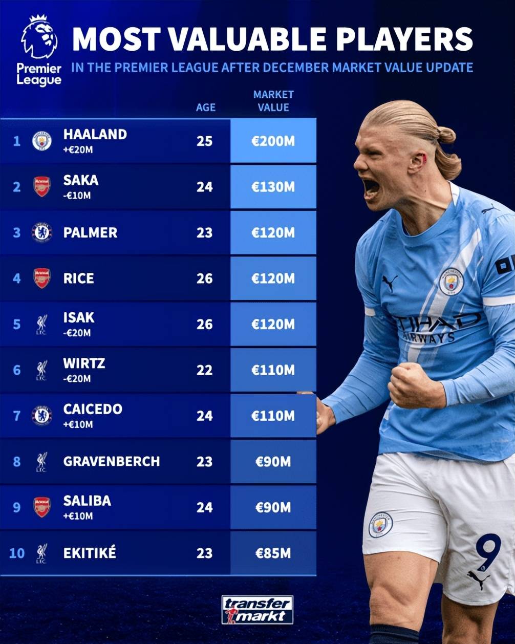 Transfermarkt ได้อัปเดตมูลค่าผู้เล่นพรีเมียร์ลีกเมื่อวันที่ 9 ธันวาคม โดย เออร์ลิง ฮาแลนด์ กลับมาอยู่ในระดับ 200 ล้านยูโรอีกครั้ง เพื่อเทียบเท่ากับ ยาร์มาล และกลับมาเป็นผู้เล่นที่มีมูลค่าสูงที่สุดในวงการฟุตบอลอีกครั้ง ขณะที่การเซ็นสัญญา 2 รายของลิเวอร์พูลในฤดูกาลนี้ที่มีมูลค่า 100 ล้านยูโร ได้แก่ อเล็กซานเดอร์ อิซัค และ ฟลอเรียน วิร์ตซ์ ต่างก็มีมูลค่าลดลง