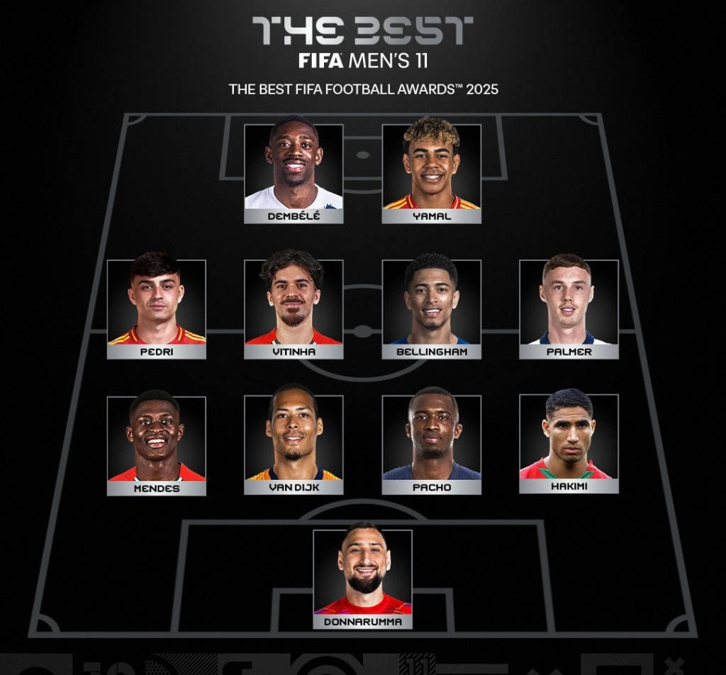 ทีมฟุตบอลชายชุดยอดเยี่ยม 11 คน มีดังนี้: ดอนนารุมมา; อาชราฟ ฮาคิมี, ปาเชโก, ฟาน ไดจ์ค, เมนเดส; พาลเมอร์, เบลลิงแฮม, วิตินญา, เปดรี; ยามาล, เดมเบเล่