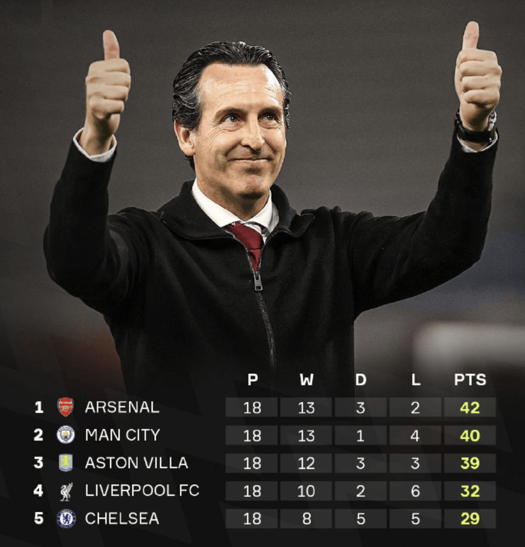 ตารางลีกล่าสุดแสดงให้เห็นว่า อาร์เซนอล ครองตำแหน่งจ่าฝูงด้วย 42 คะแนน, แมนเชสเตอร์ ซิตี้ อยู่ในอันดับสองด้วย 40 คะแนน, และ แอสตัน วิลล่า อยู่ในอันดับสามด้วย 39 คะแนน. ในเวลา 04:15 น. ของวันที่ 31 ธันวาคม, อาร์เซนอล จะเป็นเจ้าบ้านรับการมาเยือนของ แอสตัน วิลล่า ที่สนามเอมิเรตส์ สเตเดียม. นัดนี้จะเป็นการตัดสินอย่างตรงไปตรงมาว่าใครจะได้ครองแชมป์พรีเมียร์ลีกในท้ายที่สุด. หากอาร์เซนอลสามารถเอาชนะได้, พวกเขาจะยิ่งมั่นคงในตำแหน่งจ่าฝูง.