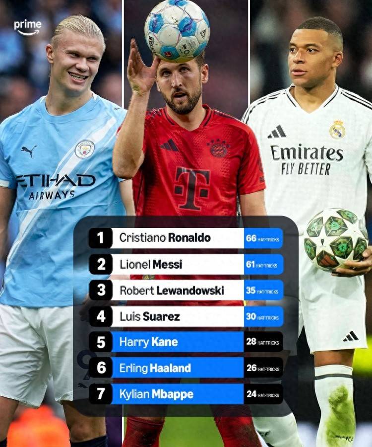 - 第七名:姆巴佩,24次戴帽!