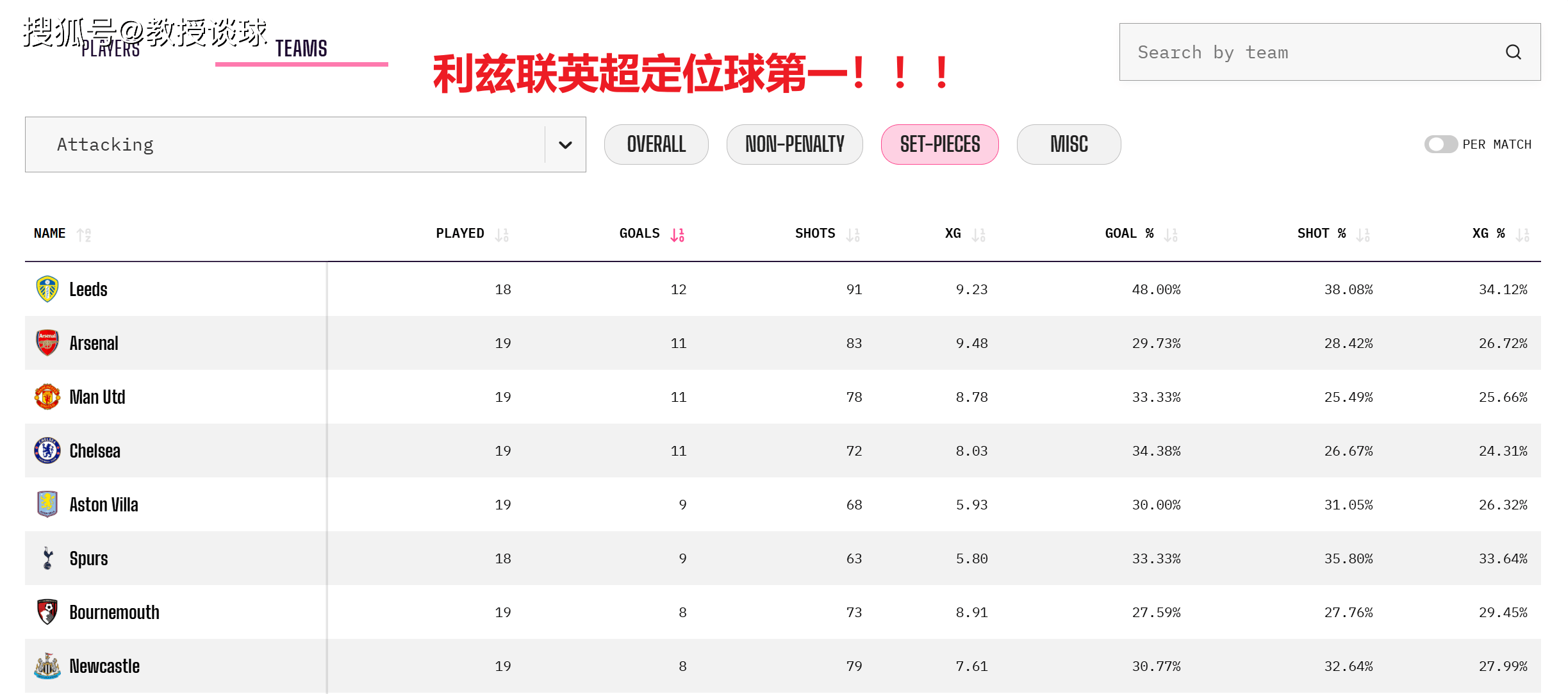 ลีดส์ ยูไนเต็ด ทำประตูจากลูกตั้งเตะได้ 12 ประตูใน 18 นัด เฉลี่ย 0.67 ประตูต่อเกม