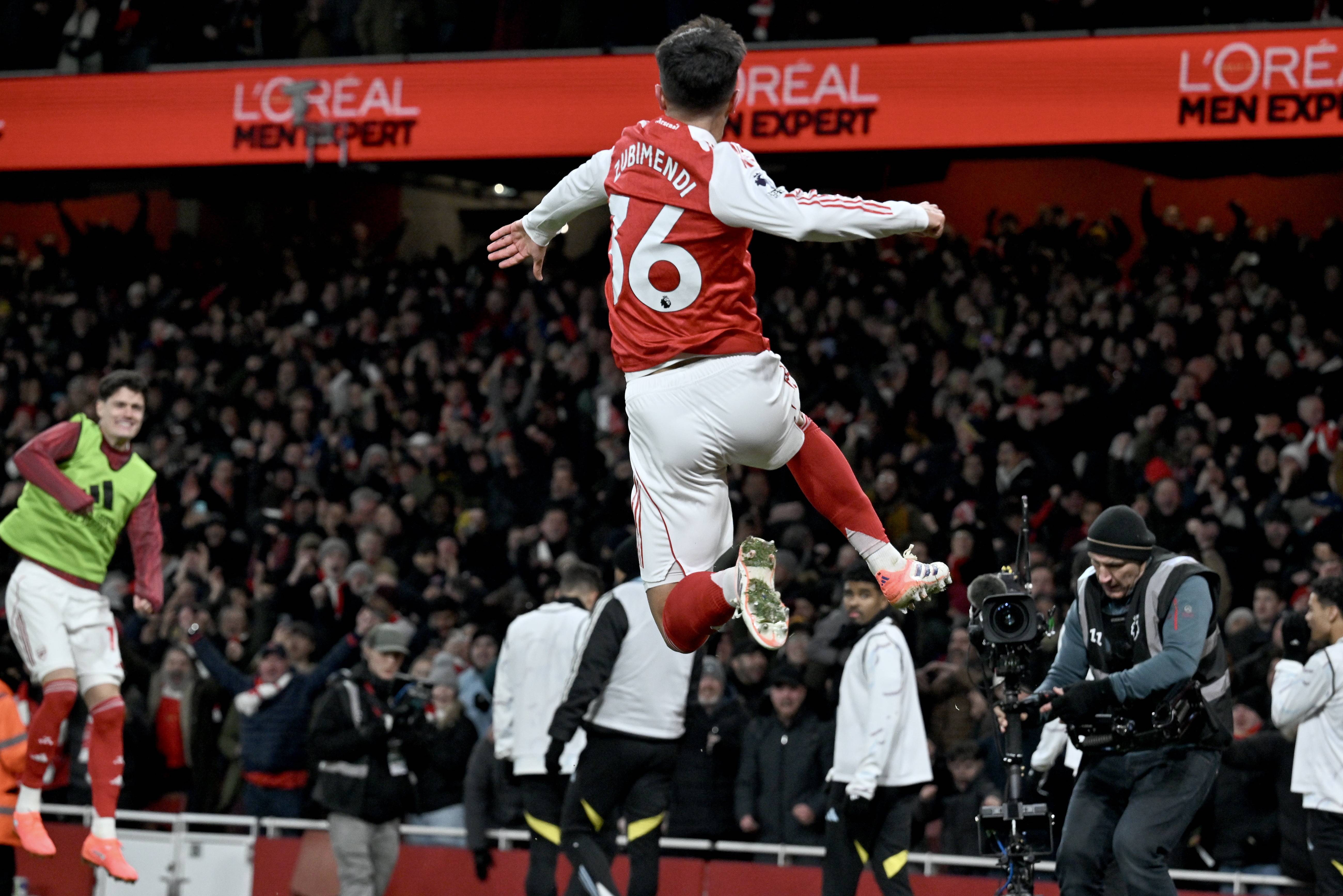 เมื่อวันที่ 30 ธันวาคม, นักเตะของอาร์เซนอล มิเกล อาร์เตตา ฉลองการทำประตูที่สองของทีม. ชินหัว/อีพีเอ
