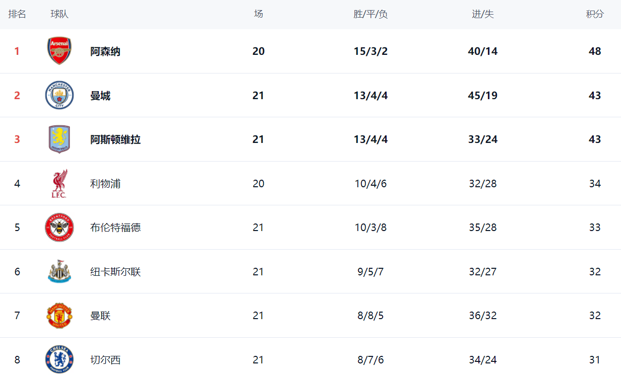 ในตารางลีก ทั้งแมนเชสเตอร์ ยูไนเต็ด และแอสตัน วิลล่า ต่างเสียคะแนน ทำให้อาร์เซนอลสามารถทำคะแนนแซงได้ อาร์เซนอลมีคะแนน 48 คะแนนแล้ว ขณะที่แมนเชสเตอร์ ซิตี้ และแอสตัน วิลล่า ต่างมีคะแนน 43 คะแนน อาร์เซนอลนำเป็นจ่าฝูงด้วยคะแนนนำ 5 คะแนน โดยเล่นน้อยกว่า 1 นัด หากอาร์เซนอลสามารถเอาชนะลิเวอร์พูลในนัดต่อไปได้ พวกเขาก็จะนำเป็นจ่าฝูงด้วยคะแนนนำ 8 คะแนนลิเวอร์พูลอยู่ในอันดับที่สี่ด้วยคะแนน 34 คะแนน. เบรนท์ฟอร์ดอยู่ในอันดับที่ห้าด้วยคะแนน 33 คะแนน. นิวคาสเซิล ยูไนเต็ด และแมนเชสเตอร์ ยูไนเต็ด ต่างมีคะแนน 32 คะแนน.