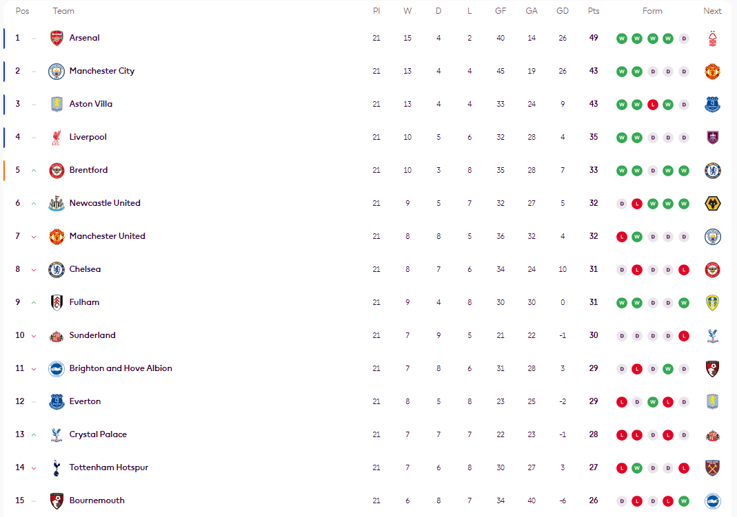 ตารางคะแนนพรีเมียร์ลีก: อาร์เซนอลรักษาคะแนนนำหกแต้มท่ามกลางลมแรง, 11 ทีมอยู่ในระยะเจ็ดแต้มจากตำแหน่งสูงสุด _แอสตัน วิลล่า_ _อาร์เซนอล_ _ลิเวอร์พูล_