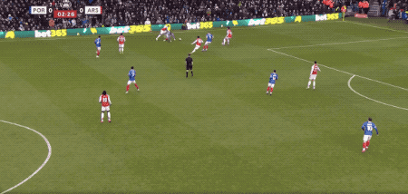 ในนาทีที่ 40 เบน ไวท์ เปิดบอลจากเส้นหลัง บอลลอยข้ามแนวรับทั้งหมด แต่ลูกยิงของมาร์ติเนลลี่ไปชนเสา
