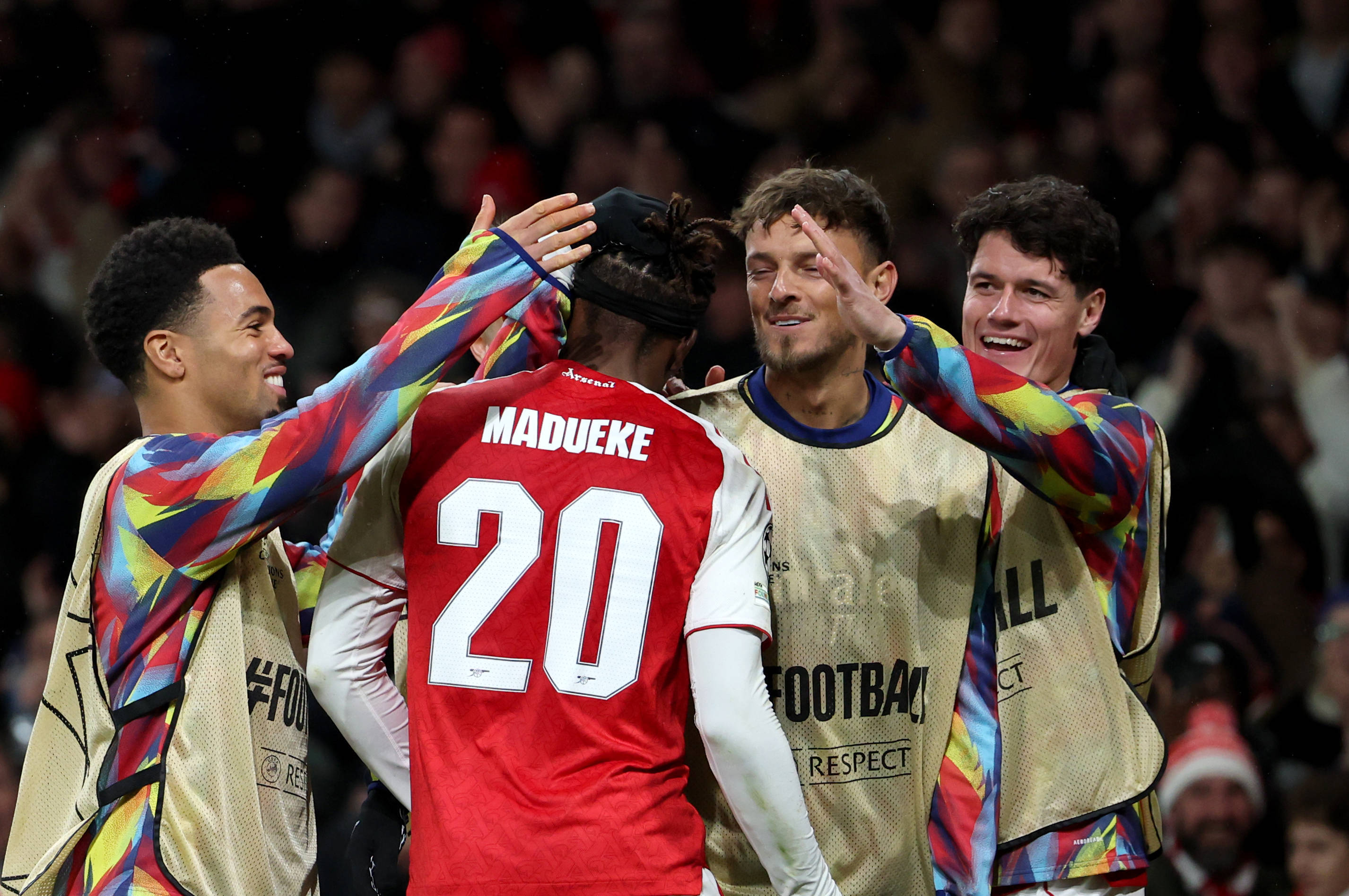 เมื่อวันที่ 26 พฤศจิกายน นักเตะอาร์เซนอล มาตุยดี้ (คนที่สามจากซ้าย) ฉลองกับเพื่อนร่วมทีมหลังจากทำประตูได้ ภาพถ่ายโดย หลี่ หยิง สำนักข่าวซินหัว