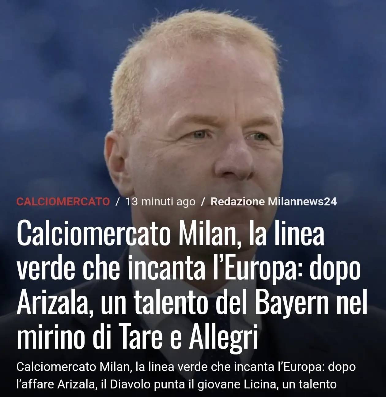 ตามรายงานของ Milannews24 เอซี มิลาน ภายใต้การคุมทีมของอัลเลกรี ไม่เพียงแต่แสดงให้เห็นถึงความคิดที่ชัดเจนในสนามเท่านั้น แต่ยังมีความมุ่งมั่นอย่างแน่วแน่ในตลาดซื้อขายนักเตะ โดยให้ความสำคัญกับ 'ช่องทางสีเขียว' สำหรับนักเตะดาวรุ่งอย่างมั่นคง กลยุทธ์ที่มองไปข้างหน้านี้เห็นได้จากการที่สโมสรใกล้จะบรรลุข้อตกลงในการเซ็นสัญญากับฮวน ดาบิด อาร์ริซา ดาวรุ่งชาวโคลอมเบียหลังจากประสบความสำเร็จในการเข้าซื้อกิจการที่มีวิสัยทัศน์ก้าวหน้านี้แล้ว ความสนใจของฝ่ายบริหารของรอสโซเนรีได้หันไปที่เป้าหมายที่มีศักยภาพสูงอีกคนหนึ่ง ซึ่งเป็นผู้เล่นที่สอดคล้องกับทิศทางกลยุทธ์ของสโมสรในการลงทุนกับนักเตะดาวรุ่งที่มีศักยภาพในการแข่งขันระดับยุโรปอย่างสมบูรณ์แบบ