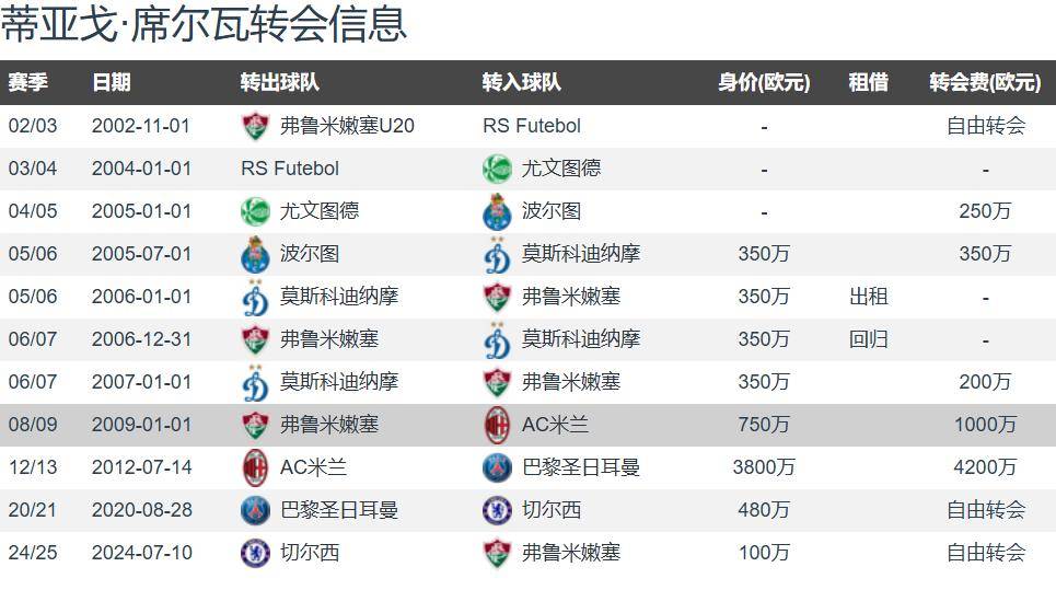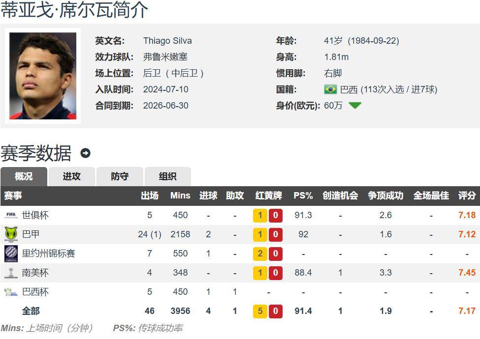 ในวัย 41 ปี ติอาโก้ ซิลวา ยังคงอยู่ในฟอร์มที่ยอดเยี่ยม โดยลงเล่นให้กับฟลูมิเนนเซ่ไปแล้ว 46 นัดในทุกรายการในฤดูกาลนี้ ทำได้ 4 ประตูและ 1 แอสซิสต์ระหว่างอาชีพในยุโรปของเขา ติอาโก้ ซิลวา ได้เล่นให้กับ เอซี มิลาน, ปารีส แซงต์-แชร์กแมง และเชลซี โดยคว้าแชมป์ยูฟ่า แชมเปียนส์ลีก กับทีมสิงห์บลูส์ในฤดูกาล 2020-21 ปัจจุบันมีมูลค่าอยู่ที่ 600,000 ยูโรบน Transfermarkt นักเตะชาวบราซิลผู้มากประสบการณ์ยังคงมุ่งมั่นที่จะเป็นตัวแทนประเทศของเขาในฟุตบอลโลกปี 2026