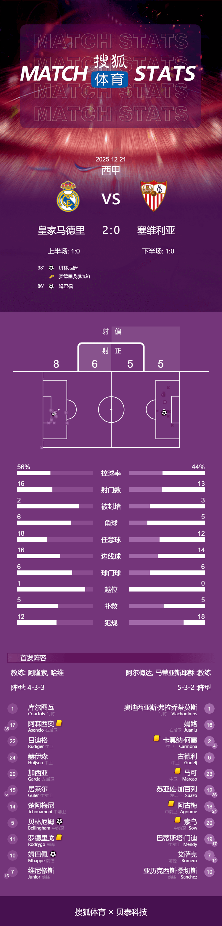 เวลา 04:00 น. ตามเวลาปักกิ่ง วันที่ 21 ธันวาคม การแข่งขันลาลีกาฤดูกาล 2025-2026 รอบที่ 17 ได้มีการแข่งขันที่น่าจับตามองเมื่อเรอัล มาดริดเปิดบ้านต้อนรับเซบีย่า ในครึ่งแรก โรดรีโก้เป็นผู้ทำแอสซิสต์ให้เบลลิงแฮมโหม่งทำประตูเบิกร่องในครึ่งหลัง เทเซร่าทำฟาวล์เบลลิงแฮมและได้รับใบเหลืองที่สอง ส่งผลให้เขาถูกไล่ออกจากสนาม โรดริโก้ได้จุดโทษจากการวิ่งทะลุช่องอย่างเฉียบคม ซึ่งคีลิยัน เอ็มบัปเป้ยิงเข้าไป ด้วยประตูนี้ เอ็มบัปเป้ทำสถิติเท่ากับคริสเตียโน่ โรนัลโด้ของเรอัล มาดริดในการทำประตูในหนึ่งปีปฏิทินที่ 59 ในที่สุด เรอัล มาดริดเอาชนะเซบีย่าที่เหลือสิบคน 2-0 คว้าชัยชนะติดต่อกันเป็นครั้งที่สามในทุกรายการ นอกจากนี้ หลังจากลงเล่นมากกว่าหนึ่งเกม พวกเขาตามหลังบาร์เซโลน่าเพียงหนึ่งแต้มเท่านั้น