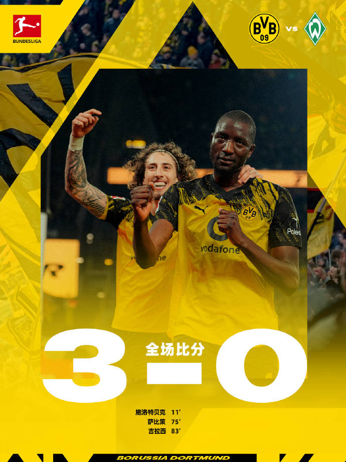 เวลา 03:30 น. ตามเวลาปักกิ่ง วันที่ 14 มกราคม 2026 โบรุสเซีย ดอร์ทมุนด์ เปิดบ้านต้อนรับการมาเยือนของแวร์เดอร์ เบรเมน ในรอบที่ 17 ของบุนเดสลีกา ในครึ่งแรก ชล็อตเตอร์เบ็ค โหม่งทำประตูจากลูกแอสซิสต์ของไลส์เนอร์ ทำให้ดอร์ทมุนด์ขึ้นนำในครึ่งหลัง ซาบิตเซอร์และจิโรดงต่างทำประตูได้คนละหนึ่งลูก ปิดฉากชัยชนะอย่างขาดลอย 3-0 ให้กับโบรุสเซีย ดอร์ทมุนด์ เหนือแวร์เดอร์ เบรเมน และคว้าชัยชนะนัดแรกของปี 2026 ได้สำเร็จ