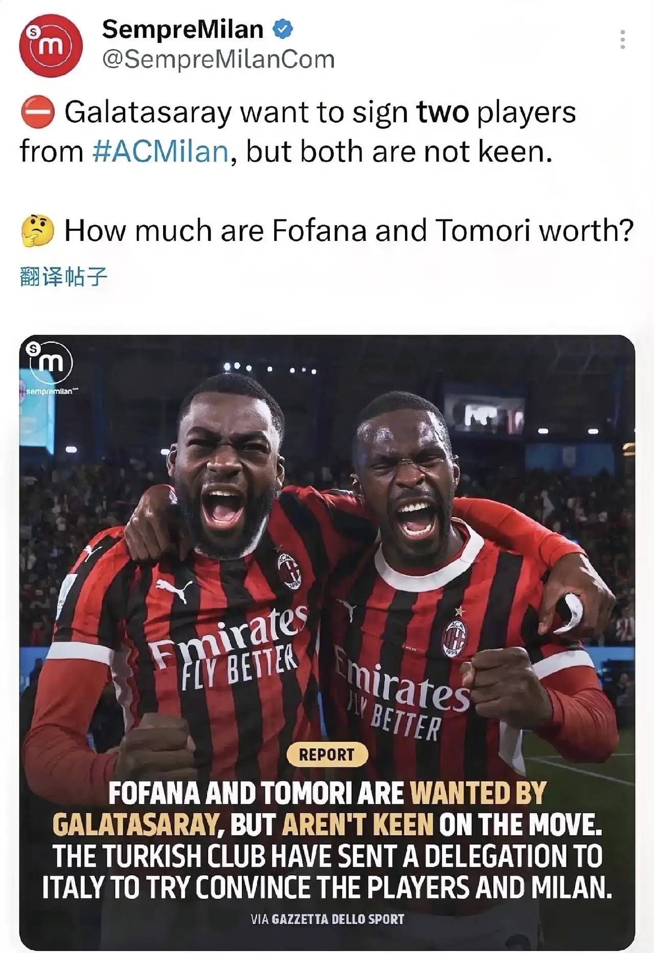 โฟฟานาและโทโมริ!กาลาตาซารายยังคงมีการเจรจาอย่างต่อเนื่องกับเอซี มิลาน เกี่ยวกับเป้าหมายการย้ายทีมของพวกเขา: กองกลางโฟฟานาและกองหลังโทโมรี รายงานก่อนหน้านี้ระบุว่ามีความคืบหน้าในเชิงบวกกับโฟฟานา โดยมิลานประเมินค่าตัวเขาไว้ที่ 40 ล้านยูโร อย่างไรก็ตาม กาลาตาซารายดูเหมือนจะเงียบไปหลังจากมีการเปิดเผยตัวเลขดังกล่าว วันนี้มีความสนใจเกิดขึ้นอีกครั้ง—คราวนี้มุ่งเน้นไปที่โทโมรีมากกว่าโฟฟานา