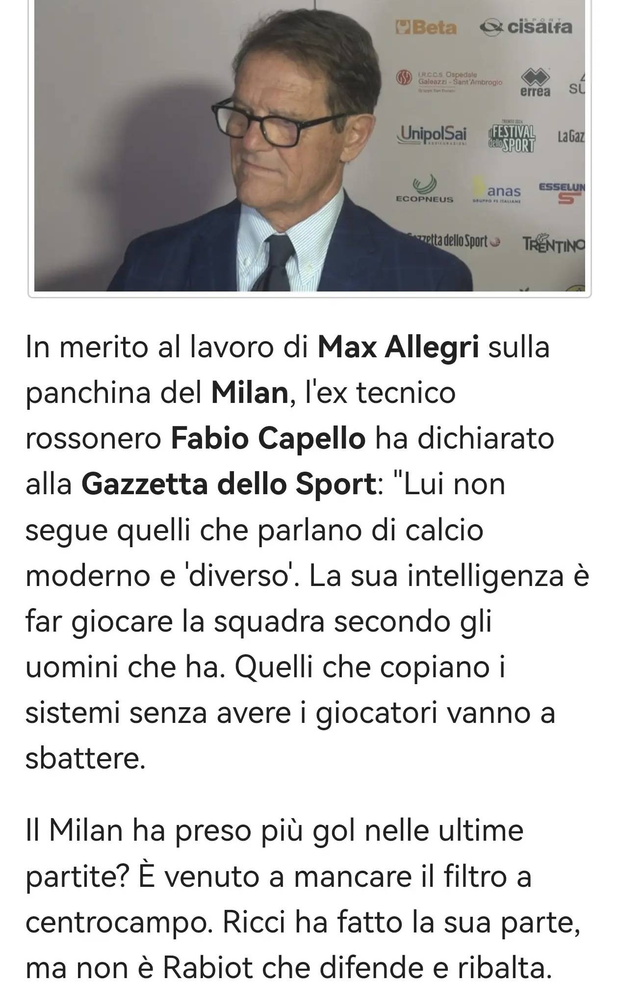 เกี่ยวกับช่วงเวลาของ มัสซิมิเลียโน่ อัลเลกรี ที่มิลาน อดีตผู้จัดการทีมรอสโซเนรี่ ฟาบิโอ คาเปลโล่ ได้แบ่งปันมุมมองของเขากับ La Gazzetta dello Sport ว่า "เขาไม่เคยสนใจคนที่พูดถึง 'ฟุตบอลสมัยใหม่' และ 'สไตล์ที่แตกต่าง' เลย"