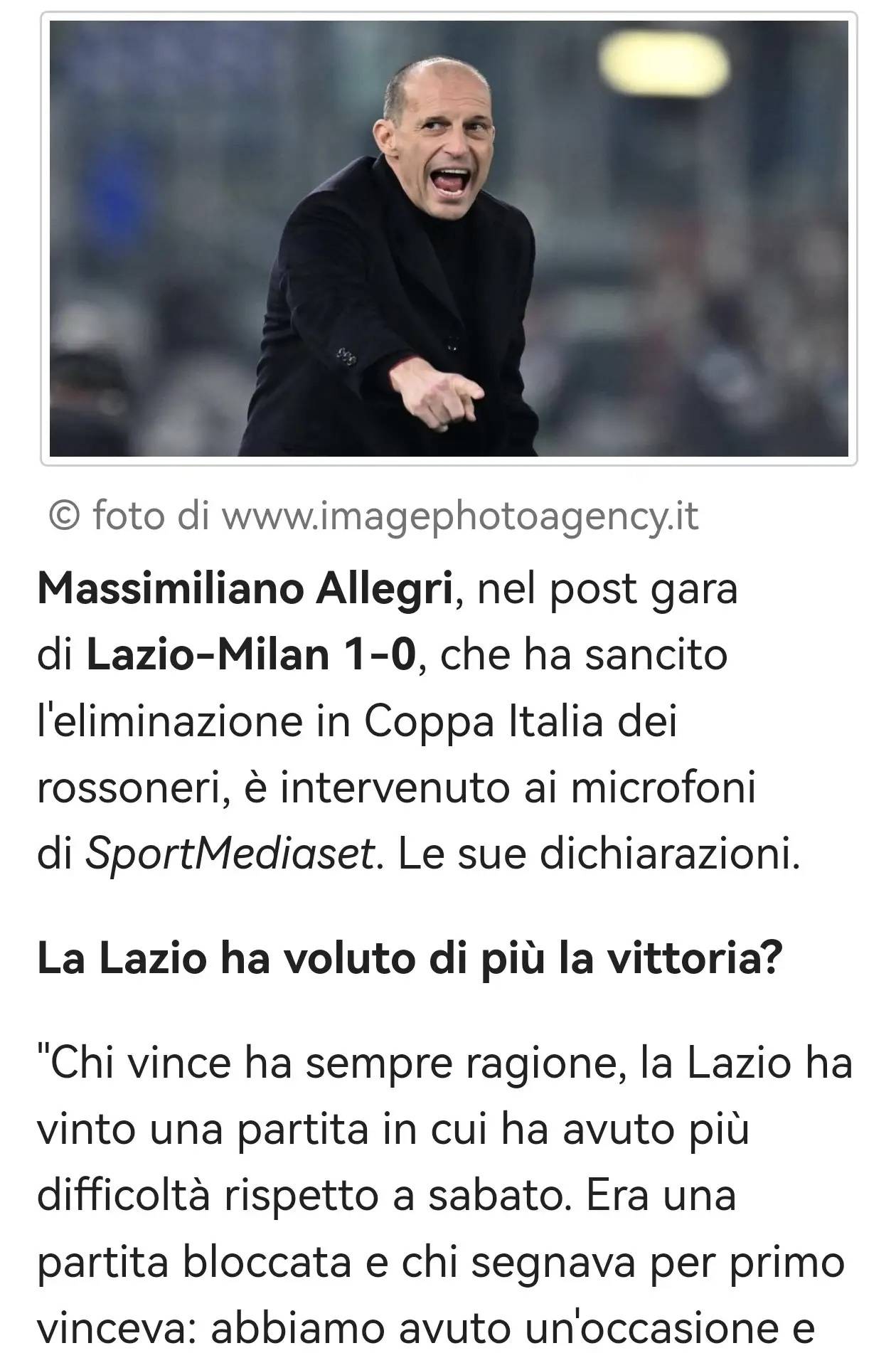หลังจากชัยชนะ 1-0 ของลาซิโอเหนือเอซี มิลาน ซึ่งทำให้รอสโซเนรีตกรอบจากรอบก่อนรองชนะเลิศโคปปา อิตาเลีย มัสซิมิเลียโน อัลเลกรีได้ให้สัมภาษณ์กับ Sportmedia ว่า: