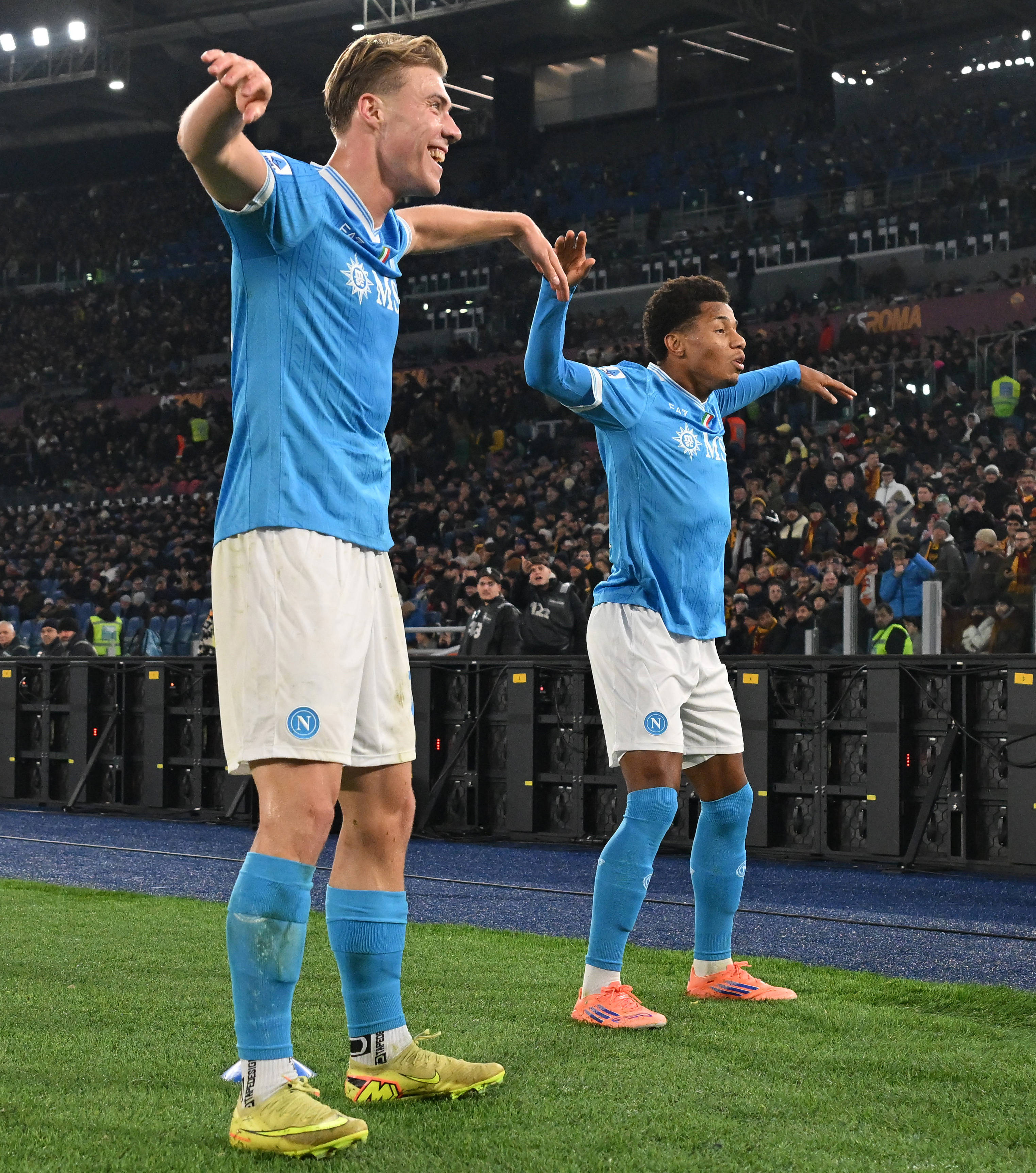 เมื่อวันที่ 30 พฤศจิกายน นักเตะนาโปลี เนเรส (ขวา) ฉลองประตูกับเพื่อนร่วมทีม ฮอยจ์ลุนด์ ระหว่างการแข่งขัน สำนักข่าวซินหัว (ภาพโดย อัลแบร์โต ลิงเลีย)