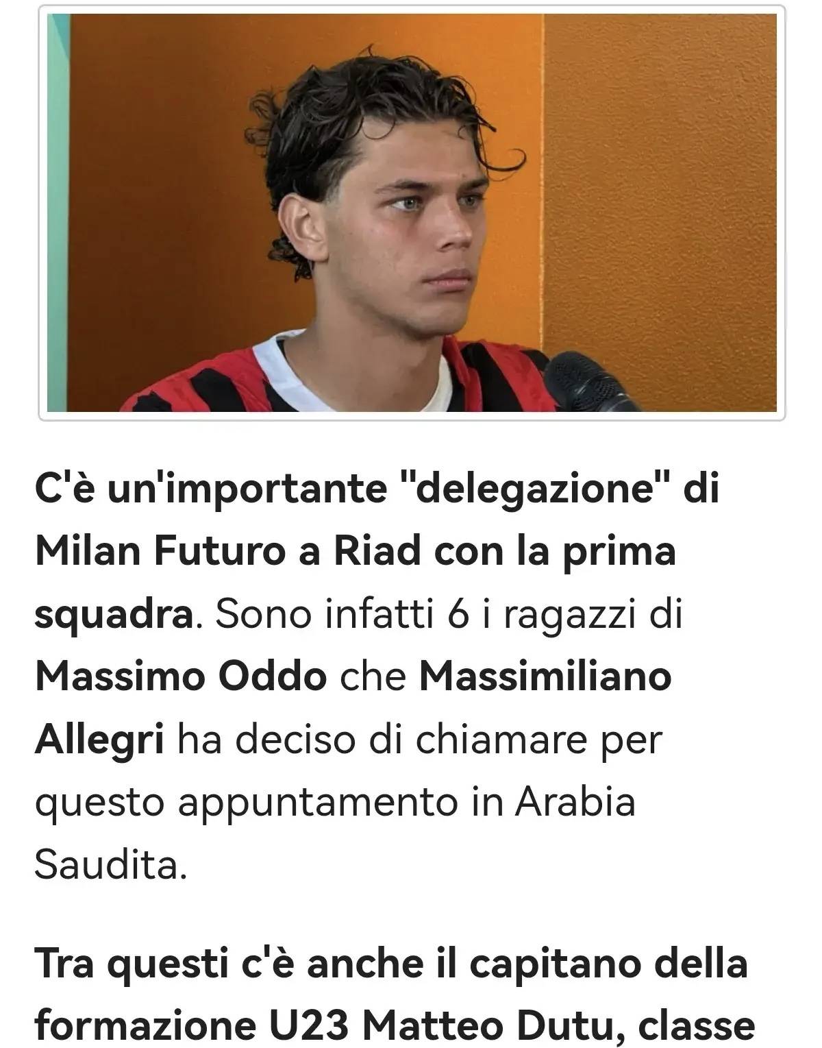 ทีมเยาวชนของเอซี มิลาน ได้ส่งคณะใหญ่เข้าร่วมกับทีมชุดใหญ่ในการเดินทางไปริยาด ผู้จัดการทีม มัสซิมิเลียโน อัลเลกรี ได้ตัดสินใจเรียกนักเตะเยาวชน 6 คนจากทีมของ มัสซิโม ออดโด้ มาร่วมทัวร์ซาอุดีอาระเบียด้วย