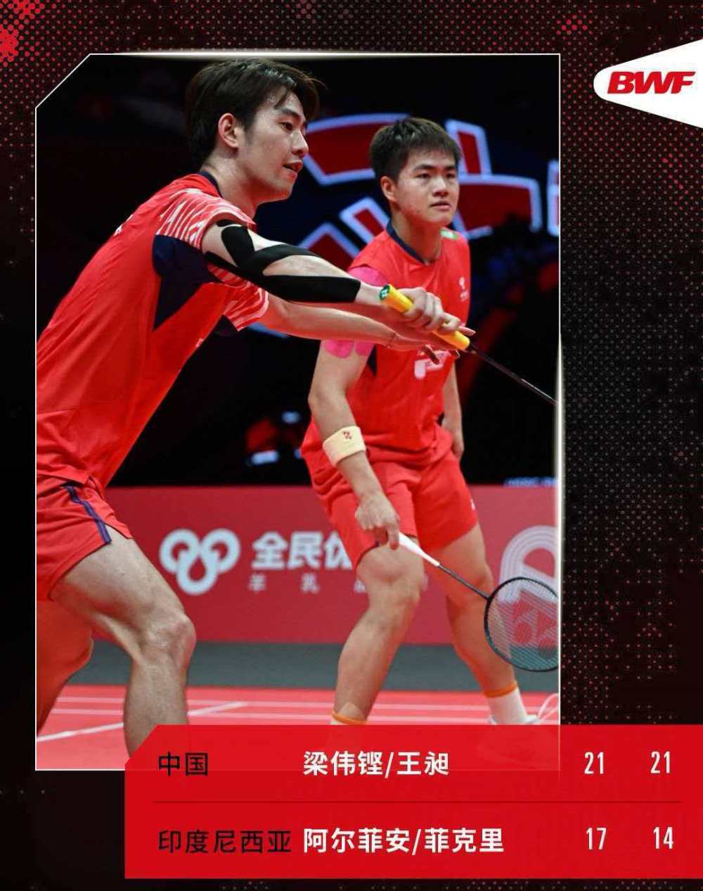 คู่ชายคู่ของจีนที่เหลืออยู่เพียงคู่เดียว คือ หลี่อัง เว่ยเกิง และ หวัง ชาง เอาชนะคู่แข่งจากอินโดนีเซีย อัลเฟียน และ ฟิกรี ไปด้วยคะแนน 21-17, 21-14 หลังจากพ่ายแพ้ในนัดแรกของการแข่งขันกลุ่ม พวกเขาก็สามารถคว้าชัยชนะติดต่อกันสองนัดเพื่อผ่านเข้าสู่รอบน็อคเอาท์ได้สำเร็จ หลังการแข่งขัน หวัง ชาง กล่าวว่า เนื่องจากไม่ได้แข่งขันในระดับนานาชาติมาเกือบสองเดือน พวกเขาค่อยๆ ฟื้นฟูฟอร์มการเล่นผ่านรอบกลุ่มนี้