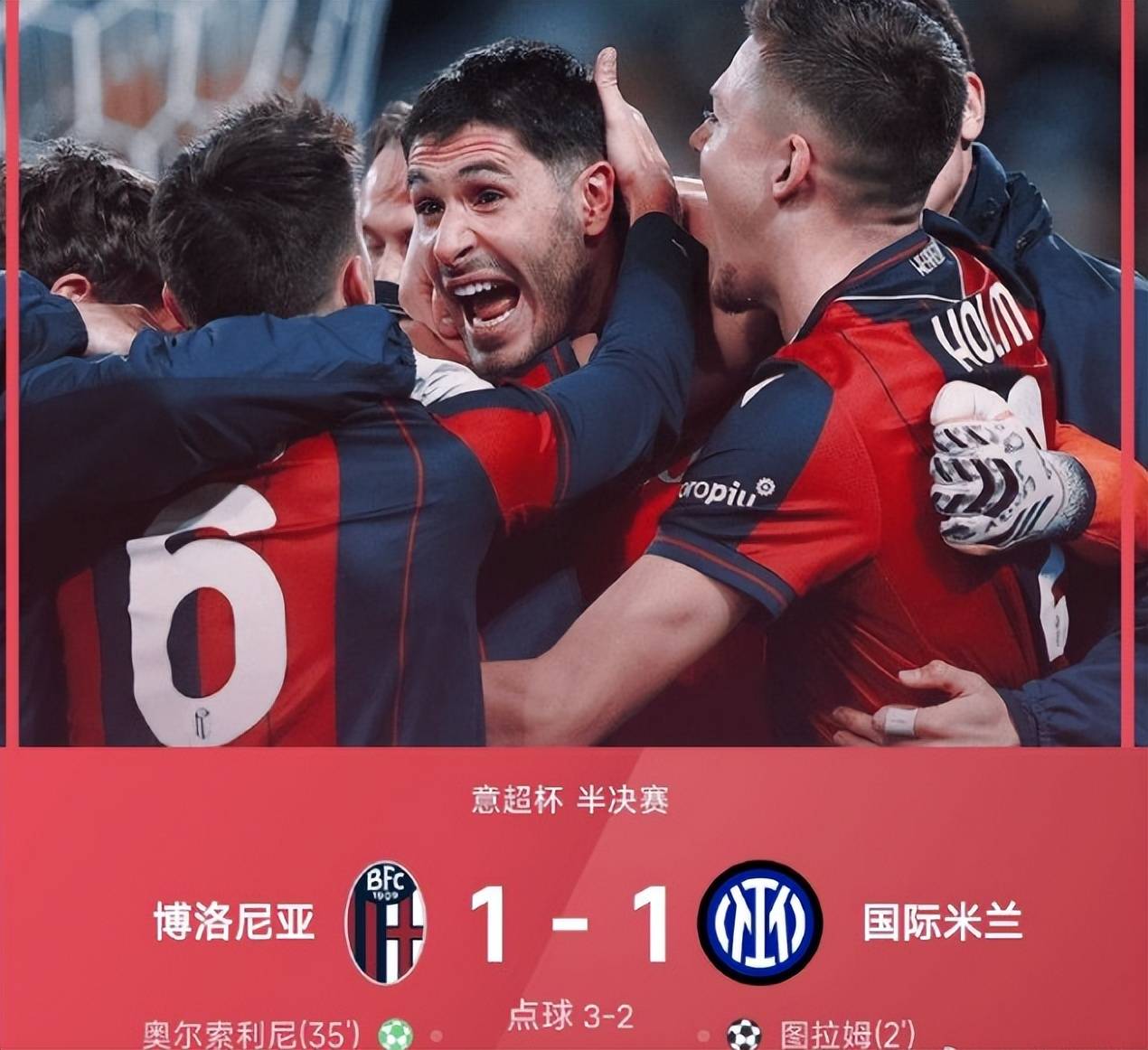 การรอดพ้นจากความพ่ายแพ้ในนาทีสุดท้ายสองครั้งติดต่อกันควรจะช่วยฟื้นความมั่นใจของอินเตอร์ได้ แต่การปรากฏตัวของโบนี่ในรอบที่สี่กลับกลายเป็นหายนะ การยิงของเขาแย่มากจนดูเหมือนการส่งบอลคืนหลัง ซึ่งผู้รักษาประตูรับไว้ได้อย่างง่ายดาย ขณะที่โจนาธาน โรลโซ่ของโบโลญญ่ายิงเข้าไปอย่างใจเย็น พาทีมขึ้นนำในรอบที่ห้า เดอ ลิกต์ กล้าหาญเผชิญหน้ากับแรงกดดันเพื่อทำประตูตีเสมออย่างน่าตื่นเต้น แต่แล้ว อิมโมบิเล่ ของโบโลญญ่า ก็ยิงจุดโทษอย่างใจเย็นเพื่อทำประตูชัยให้กับทีม อินเตอร์ มิลาน ถูกคัดออกในที่สุด
