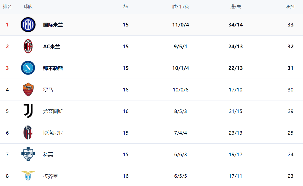 ในตารางลีก อินเตอร์ มิลาน ครองตำแหน่งจ่าฝูง ด้วยชัยชนะ 11 นัด และแพ้ 4 นัด ทำให้พวกเขามีคะแนนสะสม 33 คะแนน อันดับสองคือ เอซี มิลาน ด้วยชัยชนะ 9 นัด เสมอ 5 นัด และแพ้ 1 นัด ทำให้พวกเขามีคะแนนสะสม 32 คะแนน ตามหลัง อินเตอร์ มิลาน อยู่เพียง 1 คะแนน อันดับสามคือ นาโปลี ซึ่งได้คะแนนสะสม 31 คะแนนโรม่า แม้จะพ่ายแพ้ แต่ก็ยังคงอยู่อันดับสี่ด้วยคะแนน 30 คะแนน ยูเวนตุส หลังจากคว้าชัยชนะได้สำเร็จ ตอนนี้มีคะแนนรวม 29 คะแนน และอยู่ในอันดับที่ห้า ตามหลังโรม่าเพียง 1 คะแนนเท่านั้น พวกเขามีโอกาสที่จะทะยานเข้าสู่โซนคัดเลือกแชมเปียนส์ลีกในรอบต่อไป โบโลญญา อยู่อันดับที่หกด้วยคะแนน 25 คะแนน โคโม ภายใต้การคุมทีมของเซสก์ ฟาเบรกาส อยู่อันดับที่เจ็ดด้วยคะแนน 24 คะแนน ลาซิโอ อยู่อันดับที่แปดด้วยคะแนน 23 คะแนน