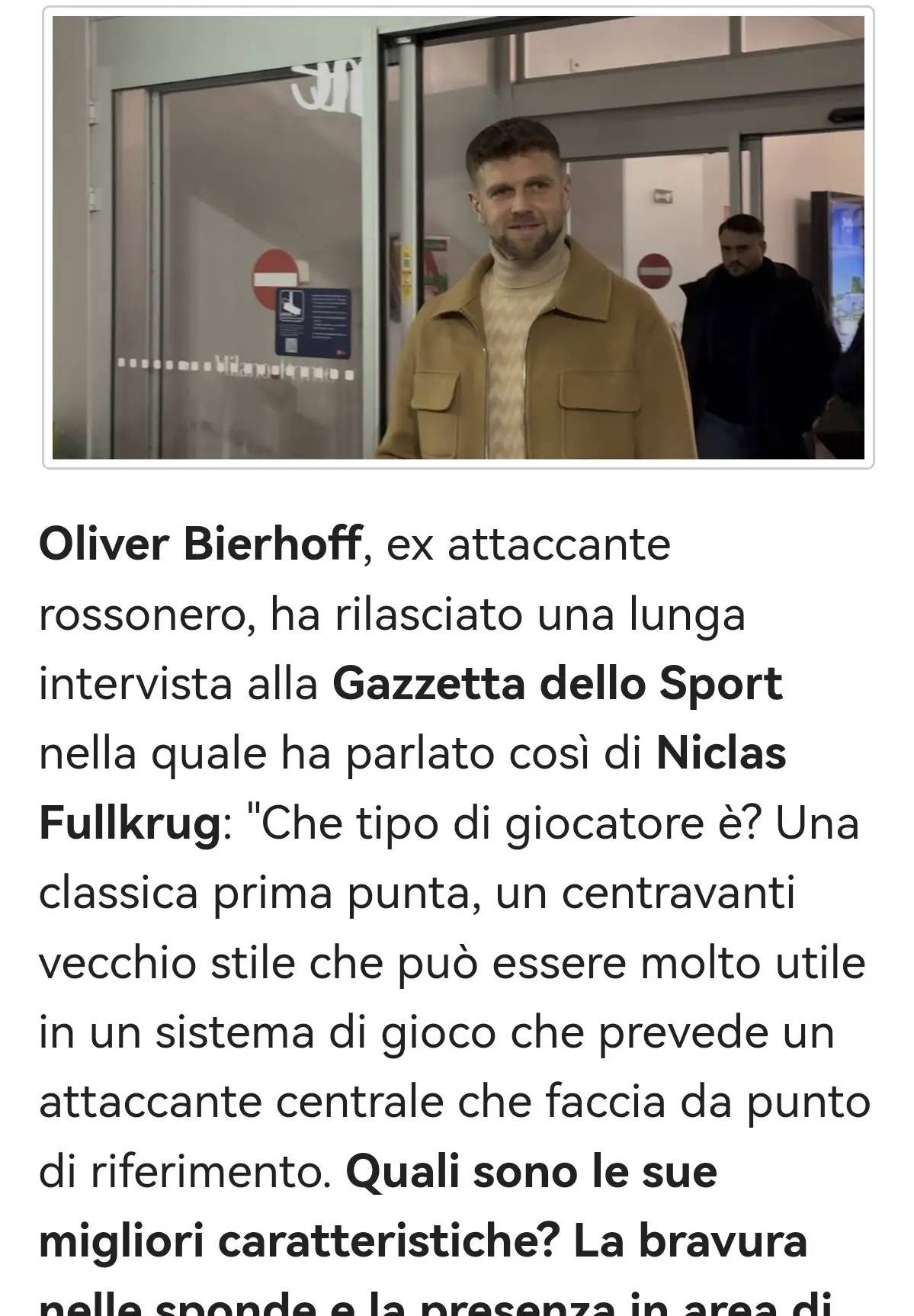 อดีตศูนย์หน้าของเอซี มิลาน โอลิเวอร์ เบียร์โฮฟฟ์ ให้สัมภาษณ์อย่างละเอียดกับลา กัซเซ็ตตา เดลโล สปอร์ต โดยเขามีความเห็นเกี่ยวกับนิคลาส ฟุลล์ครุกดังนี้:
