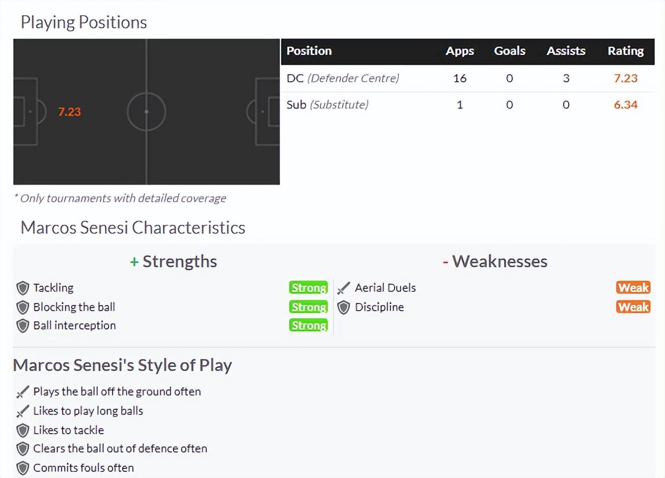 สถิติ เปิดเผยว่าในบรรดาเซ็นเตอร์แบ็คในเจ็ดลีกชั้นนำของยุโรปในฤดูกาลนี้ เซเนซีอยู่ในอันดับที่สองรองจากบาสโตนีเท่านั้นในจำนวนการส่งบอลเข้าไปในเขตโทษ ทำให้เขาอยู่ในอันดับที่สองในหมู่เพื่อนร่วมอาชีพทั้งหมด