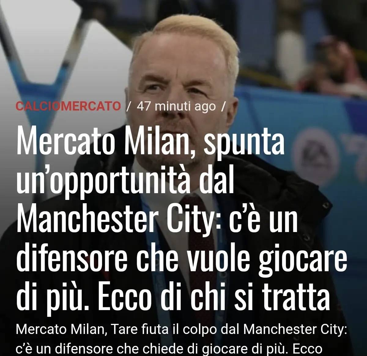 เอซี มิลาน ยังคงติดตามตลาดซื้อขายนักเตะเพื่อหาผู้เล่นในตำแหน่งกองหลังที่มีคุณภาพระดับนานาชาติ ตามรายงานของ La Gazzetta dello Sport เป้าหมายล่าสุดของสโมสรอยู่ในพรีเมียร์ลีก โดยเฉพาะในทีมของเป๊ป กวาร์ดิโอลา: นาธาน อาเก้ กองหลังชาวดัตช์ของแมนเชสเตอร์ ซิตี้ มิลานเคยแสดงความสนใจในตัวนักเตะรายนี้เมื่อประมาณสองปีที่แล้ว การเจรจาระหว่างทั้งสองฝ่ายอาจเริ่มต้นขึ้นในอีกไม่กี่วันข้างหน้า ซึ่งอาจทำให้การย้ายทีมครั้งนี้กลายเป็นหนึ่งในดีลใหญ่ของตลาดซื้อขายนักเตะช่วงฤดูหนาวนี้