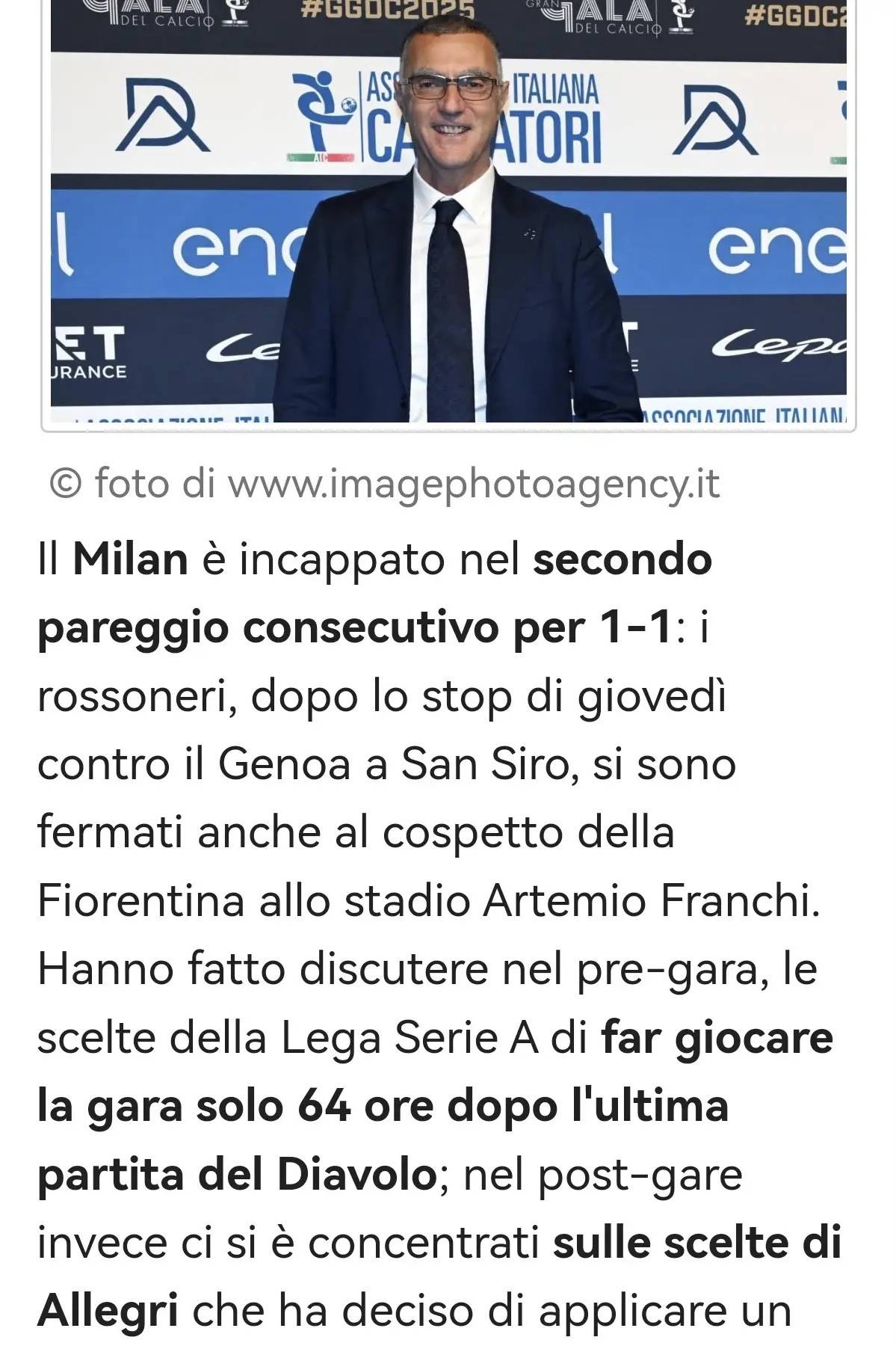 เอซี มิลาน ประสบความพ่ายแพ้เป็นนัดที่สองติดต่อกันด้วยผลเสมอ 1-1: หลังจากเกมที่เสมอกับเจนัว 0-0 ที่สนามซาน ซิโร ในวันพฤหัสบดีที่ผ่านมา ทีมรอสโซเนรีได้แบ่งแต้มกับฟิออเรนตินาที่สนามอาร์เตมิโอ ฟรานคิ สเตเดียม การตัดสินใจของลีกเซเรีย อา ที่จัดให้มีการแข่งขันของมิลานเพียง 64 ชั่วโมงหลังจากเกมก่อนหน้านี้ได้ก่อให้เกิดความขัดแย้งอย่างมากก่อนเริ่มการแข่งขัน