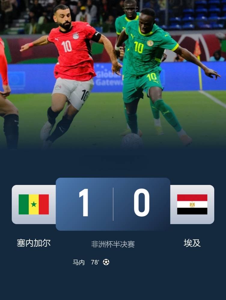 สรุปการแข่งขันรอบรองชนะเลิศแอฟริกา คัพ ออฟ เนชั่นส์: เซเนกัลเฉือนชนะอียิปต์ 1-0 ผ่านเข้าสู่รอบชิงชนะเลิศ โดยซาดิโอ มาเน่ ยิงประตูชัยในนาทีที่ 78 ด้วยลูกยิงต่ำเสียบมุม อียิปต์มีโอกาสยิงตรงกรอบเพียงครั้งเดียวตลอดทั้งเกม! มาเน่เอาชนะโมฮาเหม็ด ซาลาห์ อดีตคู่แข่งร่วมทีมลิเวอร์พูลได้สำเร็จ