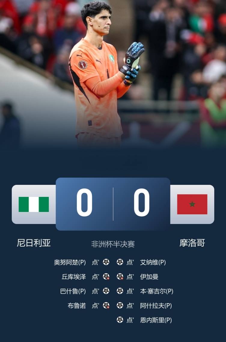 ในรอบรองชนะเลิศอีกคู่ของแอฟริกา คัพ ออฟ เนชั่นส์ ไนจีเรียเสมอกับโมร็อกโก 0-0 ทำให้ต้องตัดสินด้วยการยิงลูกโทษ บูนูเซฟลูกโทษได้สองครั้ง ขณะที่อัชราฟ ฮาคิมีและยาสซีน เอ็น-เนซีรี ยิงลูกโทษได้ทั้งสองคน ทำให้โมร็อกโกผ่านเข้าสู่รอบชิงชนะเลิศโดยเอาชนะไนจีเรีย
