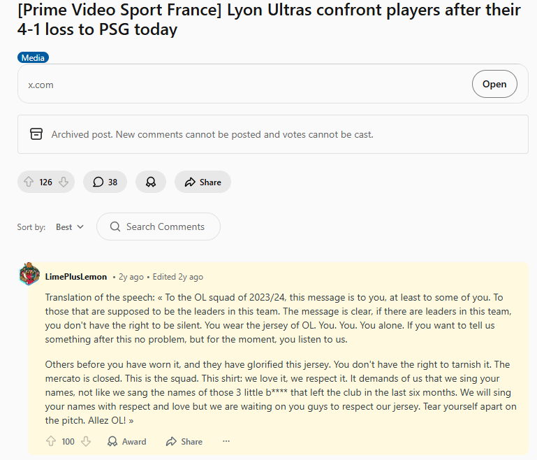 เมื่อมองย้อนกลับไปที่ตัวอย่างของ 'คำพูด' ของลียง แม้ว่าผู้เล่นจะดูเหมือนยอมรับชะตากรรมที่ต้องยืนอยู่ต่อหน้าผู้สนับสนุนและเสียงเชียร์และสีหน้าของแฟนๆ ที่แสดงออกถึงความรู้สึกอย่างชัดเจน แต่เนื้อหาที่แท้จริงของคำพูดของเขากลับมีถ้อยคำที่ก้าวร้าวเพียงเล็กน้อย แทนที่จะเป็นเช่นนั้น เขากล่าวว่า 'เราจะสนับสนุนทีมเสมอ แต่เราต้องการให้ผู้เล่นแสดงจิตวิญญาณการต่อสู้ก่อน' โดยคำวิจารณ์เฉพาะเจาะจงนั้นค่อนข้างอ่อนโยน