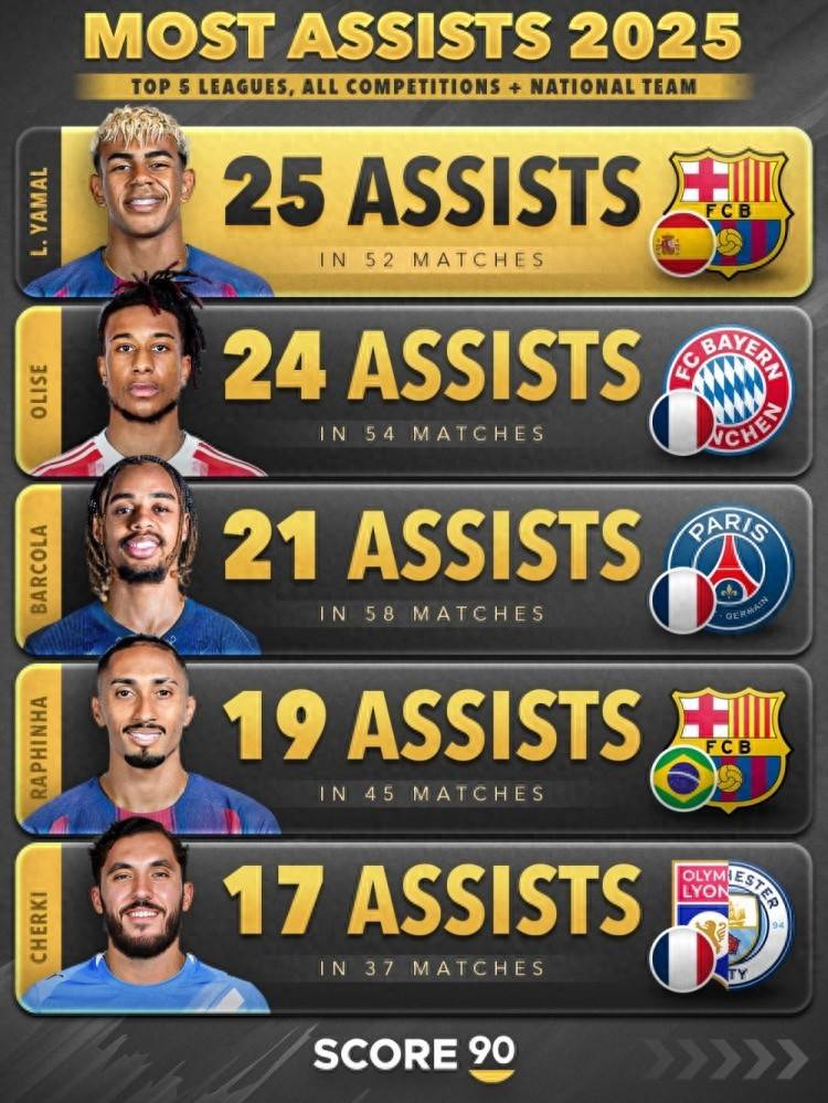 2025 อันดับสูงสุดห้าลีก ผู้ทำแอสซิสต์: ยามาลนำด้วย 25 แอสซิสต์, โอลิเซ่ที่สอง, นักเตะใหม่ของซิตี้อยู่อันดับห้า เชอร์กิ โอลิเซ่, บาร์เซโลนา
