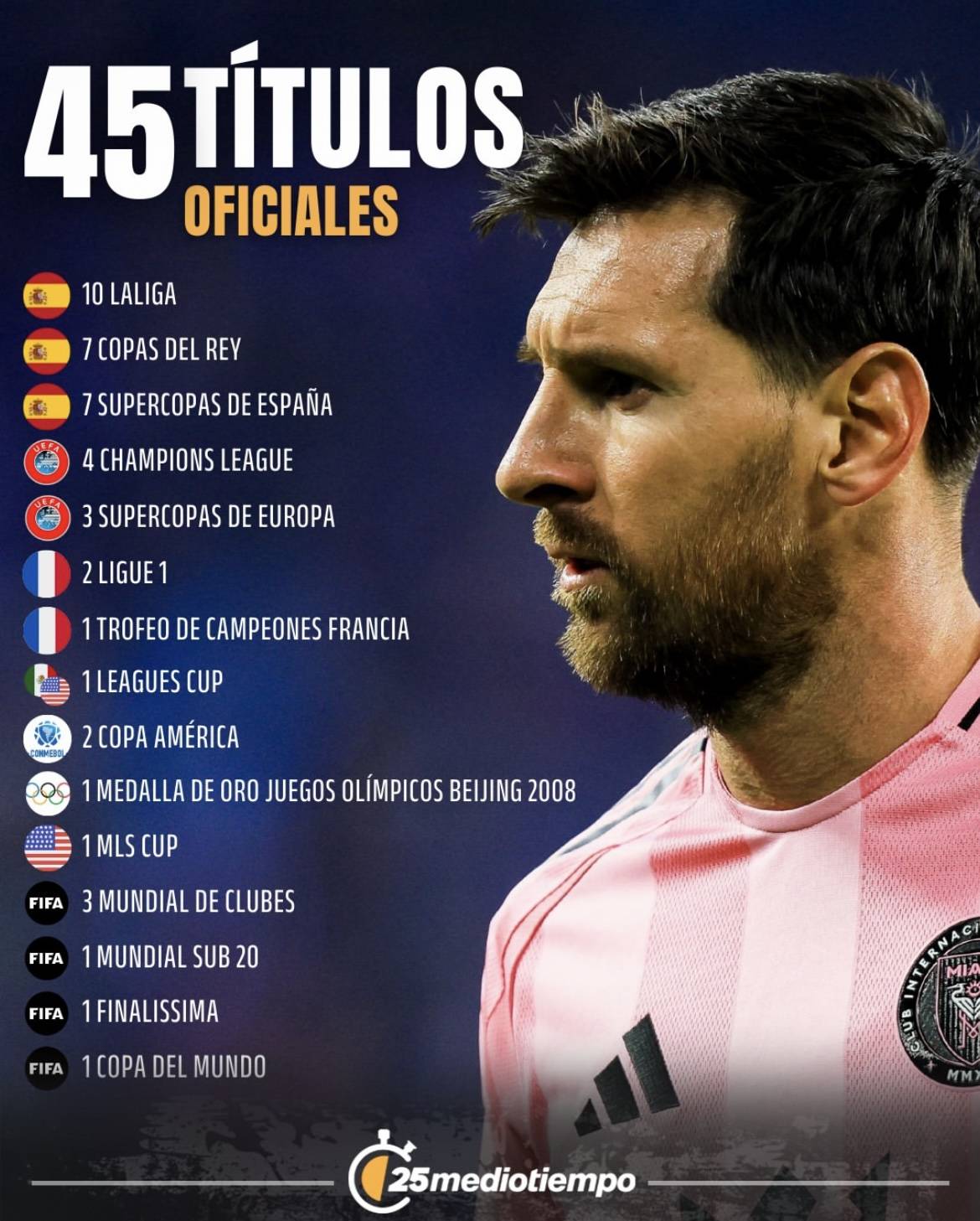 ลิโอเนล เมสซี ได้สะสมถ้วยรางวัลทั้งในระดับสโมสรและทีมชาติที่คิดได้ทั้งหมด ตั้งแต่ลาลีกาและแชมเปียนส์ลีกไปจนถึงสโมสรโลก และจากโคปาอเมริกาและโอลิมปิกไปจนถึงฟุตบอลโลก ด้วยจำนวนถ้วยรางวัลที่ใกล้ถึงห้าสิบใบ ความสำเร็จเช่นนี้ต้องการความฟิตที่ต่อเนื่อง บทบาทสำคัญในสโมสรระดับซูเปอร์ และการสอดคล้องกับยุคทองของทีมชาติของเขา – การบรรจบกันที่หายากของยุค แพลตฟอร์ม และความสามารถเฉพาะตัวแม้แต่สำหรับผู้เล่นที่ดีที่สุดในโลก การแข่งขันเพื่อชิงตำแหน่งแชมป์ปีแล้วปีเล่า และการคว้าถ้วยรางวัลอย่างต่อเนื่องตลอดระยะเวลาหลายสิบปี ก็ยังไม่ใช่เรื่องปกติ