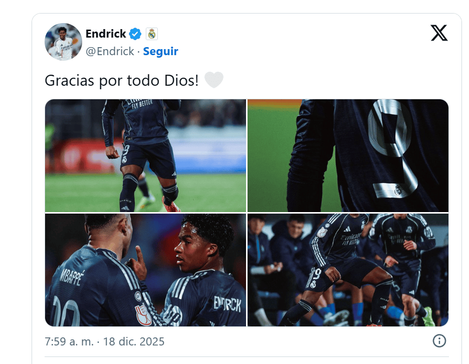 เอนดริค กองหน้าดาวรุ่งชาวบราซิล ได้ออกสตาร์ทเป็นตัวจริงในเกมที่เรอัล มาดริด บุกไปเอาชนะทาราเบกา 3-2 ในศึกโกปา เดล เรย์ โดยเขาลงสนามอย่างเต็มที่ถึง 77 นาที แม้จะไม่สามารถทำประตูได้ แต่ความกระตือรือร้นและฟอร์มการเล่นอันโดดเด่นของเขาได้สร้างความประทับใจให้กับแฟนบอลอย่างมากหลังจบการแข่งขัน เขาได้โพสต์ข้อความอำลาบนโซเชียลมีเดีย ซึ่งจุดกระแสการคาดเดาและการพูดคุยในวงกว้าง นี่ถือเป็นการบอกลาเสื้อสีขาวของซานติอาโก้ เบร์นาเบว ขณะที่เขากำลังเริ่มต้นบทใหม่กับสโมสรโอลิมปิก ลียง ในลีกเอิง ฝรั่งเศส