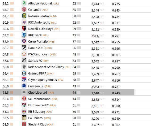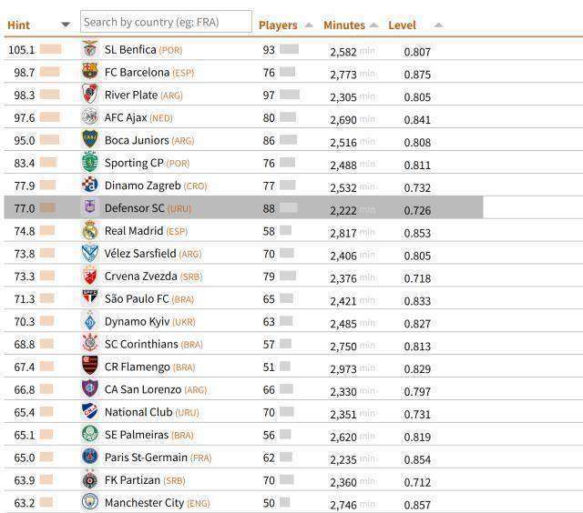 รายงานระบุว่าในช่วงปีที่ผ่านมา มีนักเตะ 93 คนที่พัฒนาผ่านสถาบันเยาวชนของเบนฟิก้าได้ลงเล่นในลีกทั้ง 49 ลีกเหล่านี้ โดยสโมสรของพวกเขาเฉลี่ยมีนักเตะ 0.81 คนต่อทีม และนักเตะเหล่านี้มีเวลาลงเล่นเฉลี่ย 2,582 นาทีต่อคนเมื่อพิจารณาทุกปัจจัยแล้ว เบนฟิก้าอยู่ในอันดับที่หนึ่ง บาร์เซโลนาอยู่ในอันดับที่สอง โดยมีผู้เล่น 76 คนที่พัฒนาโดยสโมสรปรากฏใน 49 ลีกต่างๆ โดยมีคะแนนสโมสรเฉลี่ย 0.87 และเวลาเล่นเฉลี่ยของผู้เล่น 2,773 นาที ริเวอร์เพลทอยู่ในอันดับที่สาม โดยมีผู้เล่น 97 คนแข่งขันใน 49 ลีกต่างๆ โดยมีคะแนนสโมสรเฉลี่ย 0.81 และเวลาเล่นเฉลี่ยของผู้เล่น 2,305 นาที