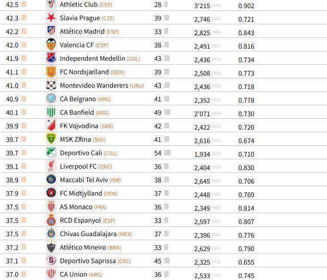 สเปนมีสโมสรถึงแปดแห่งในรายชื่อนี้ ได้แก่ บาร์เซโลนา, เรอัล มาดริด, เรอัล โซเซียดาด, แอธเลติก บิลเบา, แอตเลติโก มาดริด, บาเลนเซีย, เอสปันญอล และบียาร์เรอัล ขณะที่เอเรดิวิซีของเนเธอร์แลนด์มีสี่สโมสร ได้แก่ อาแจ็กซ์, พีเอสวี ไอนด์โฮเฟน, เอแซด อัลค์มาร์ และเฟเยนูร์ดอุรุกวัยมีสโมสรถึงหกแห่งในรายชื่อ ได้แก่ เดเฟนซอร์ สปอร์ติ้ง, นาซิอองนาล, ดาเนียบีโอ, เปนารอล, วันเดอเรอร์ส และลิเวอร์พูล