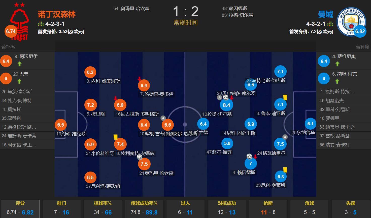แมนเชสเตอร์ ซิตี้ ครองเกมได้อย่างเหนือชั้นแม้จะเล่นเป็นทีมเยือน โดยครองบอลได้มากกว่าตลอดทั้งเกม อย่างไรก็ตาม ด้วยการที่ดูคูถูกพักและฮาแลนด์ถูกประกบติดแน่น ทำให้ตัวเลือกในการโจมตีของทีมดูมีจำกัด เซร์กี้ ซึ่งเซ็นสัญญาจากลียงในช่วงซัมเมอร์ด้วยค่าตัว 36.5 ล้านยูโร พิสูจน์ให้เห็นแล้วว่าเป็นนักเตะที่คุ้มค่าอย่างยิ่งเซร์คิโอ เปลี่ยนโฉมการแข่งขันอย่างสิ้นเชิง โดยเริ่มจากการทำแอสซิสต์ให้ไรนาร์ตส์ทำลายสกอร์ที่เสมอกันอยู่ จากนั้นก็จบสกอร์อย่างเฉียบขาดด้วยการยิงประตูที่ยอดเยี่ยมเพื่อปิดเกม และทำประตูและแอสซิสต์ได้สองครั้ง ในการที่เดอ บรอยน์ ออกจากทีม เซร์คิโอได้ก้าวขึ้นมาเป็นกำลังสร้างสรรค์เกมรุกหลักของแมนเชสเตอร์ ซิตี้ ความคิดสร้างสรรค์ของเขาพิสูจน์ให้เห็นว่ามีประสิทธิภาพอย่างยิ่งเมื่อต้องเจอกับแนวรับที่แน่นหนา ทำให้เขากลายเป็นอาวุธสำคัญในการทำลายกำแพงป้องกันในฤดูกาลนี้ เซอร์ดานมีส่วนร่วม 6 ประตูและ 9 แอสซิสต์จากการลงสนาม 23 นัด รวมถึง 2 ประตูและ 7 แอสซิสต์ใน 13 นัดพรีเมียร์ลีก โดยรับภาระหน้าที่ในการโจมตีของแมนเชสเตอร์ซิตี้อย่างเต็มที่ หลังการแข่งขัน เขาได้รับคะแนน 8.4 ซึ่งเป็นผู้เล่นเพียงคนเดียวที่ได้คะแนนเกิน 8 และกลายเป็นบุคคลสำคัญในชัยชนะ 2-1 ของซิตี้เหนือน็อตติงแฮมฟอเรสต์ ซึ่งทำให้พวกเขาขึ้นสู่อันดับสูงสุดชั่วคราว ชัยชนะของทีมบลูส์อยู่ในความสมดุล และเราต้องขอบคุณเซอร์ดานทั้งหมด!