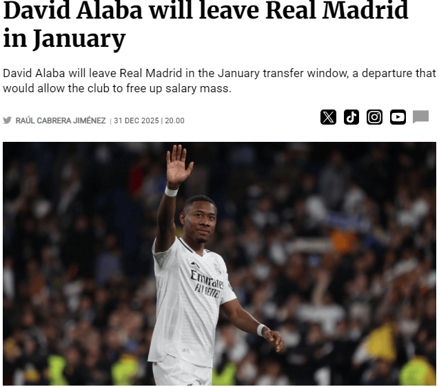 เมื่อวันที่ 1 มกราคม ตามเวลาปักกิ่ง ตลาดซื้อขายนักเตะฤดูหนาวของลาลีกาได้เปิดอย่างเป็นทางการแล้ว ตามรายงานจากสื่อสเปนอย่าง "fichajes" ระบุว่า เรอัล มาดริด กำลังพิจารณาข้อเสนอจากสหรัฐอเมริกาอย่างรอบคอบสำหรับดาวิด อลาบา กองหลังชาวออสเตรีย ซึ่งเป็นหนึ่งในนักเตะที่ได้รับค่าจ้างสูงที่สุดของสโมสร ข้อเสนอที่รายงานว่ามาจากสโมสรชาร์ล็อตต์ เอฟซี แห่งเมเจอร์ลีก ซ็อคเกอร์ ต้องการเซ็นสัญญากับอลาบาด้วยค่าตัว 1.5 ล้านยูโร