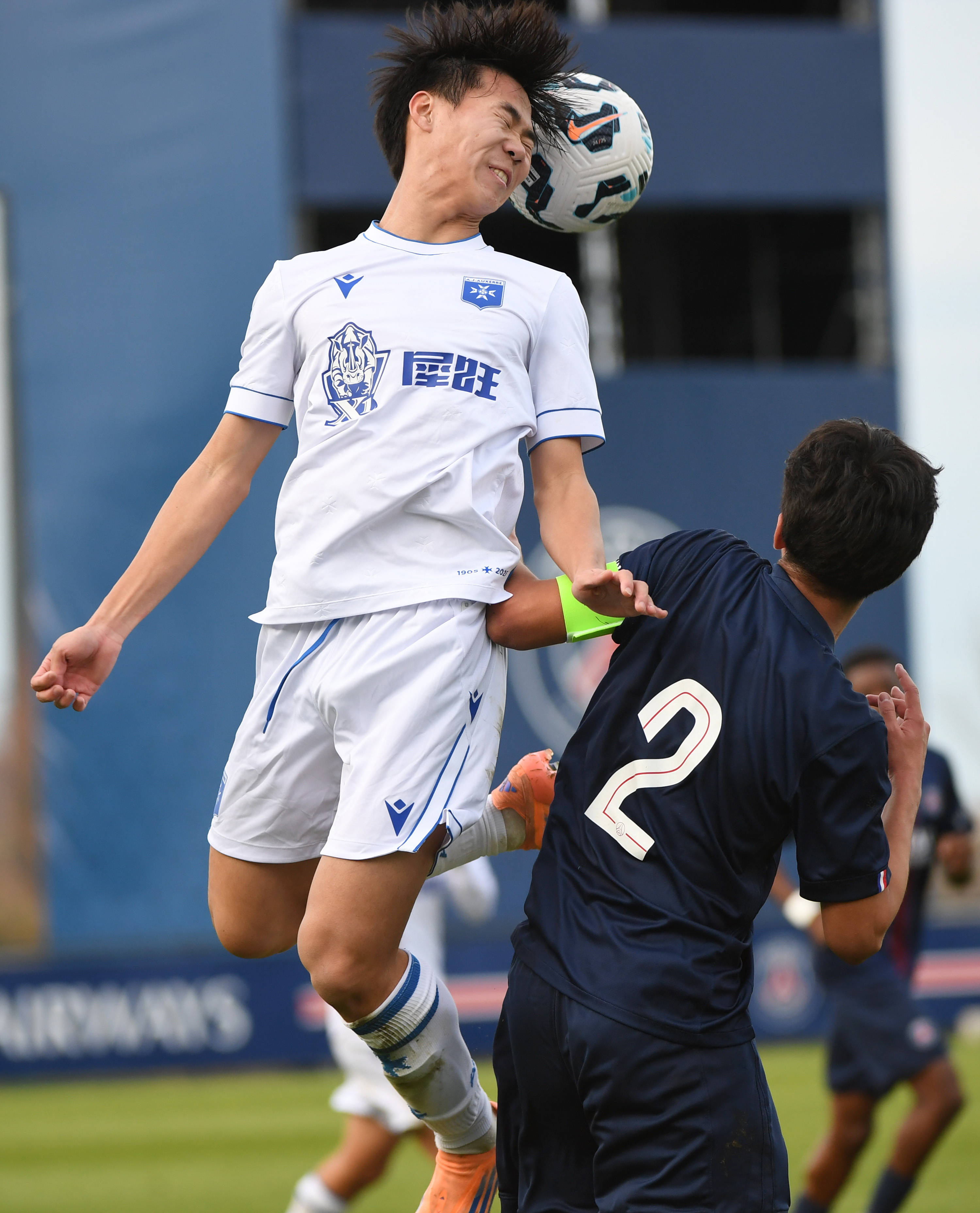 เมื่อวันที่ 13 มกราคม จาง จื้อเซียว (ซ้าย) จากทีมซีหวังของจีน กำลังเคลียร์บอลระหว่างการแข่งขัน ภาพถ่ายโดย เหอ ฉานหลิง สำนักข่าวซินหัว