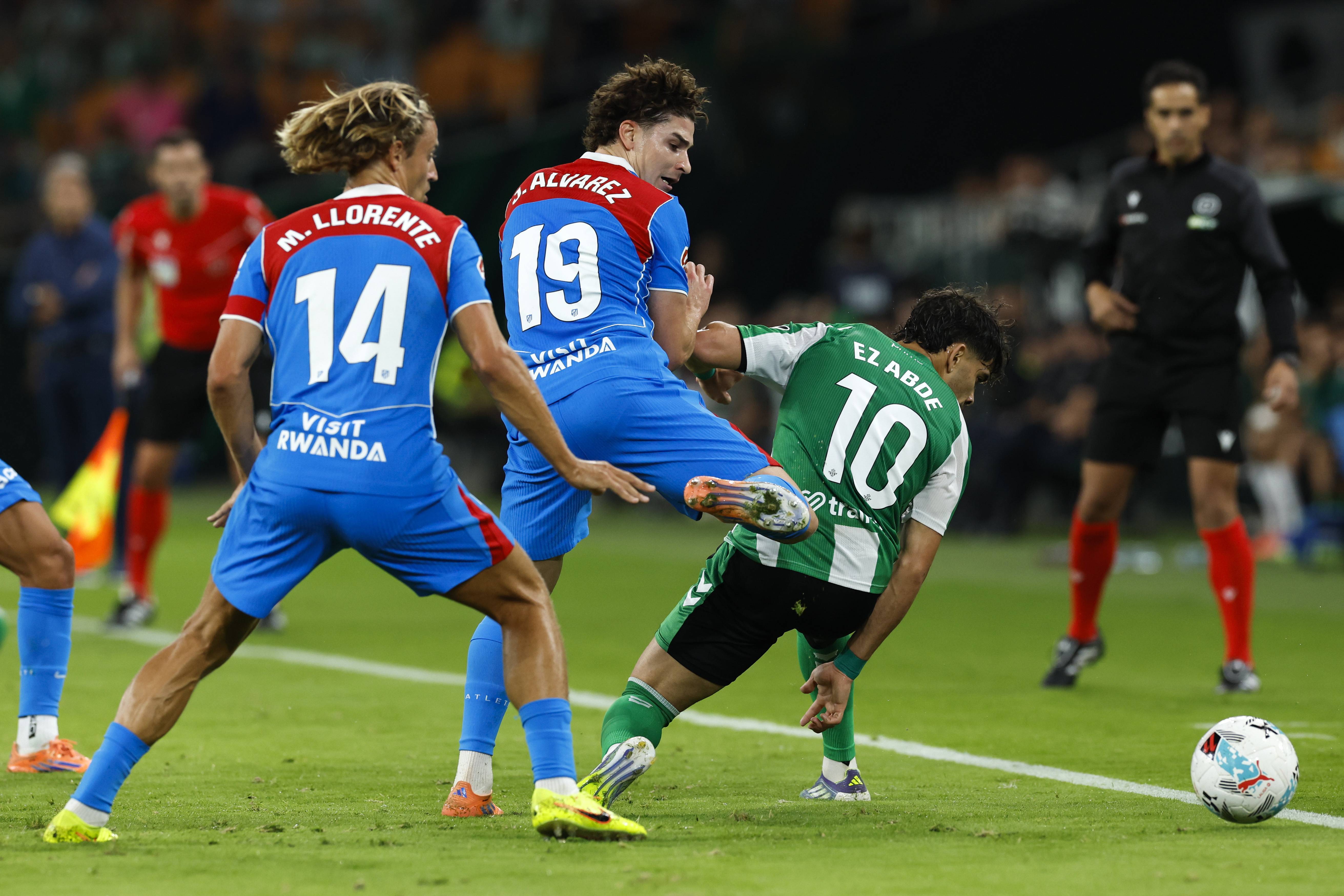 เมื่อวันที่ 27 ตุลาคม นักเตะแอตเลติโก มาดริด ลlorente (ซ้าย) และ Álvarez (กลาง) ท้าทายนักเตะเรอัล เบติส Abdou. Xinhua/EPA