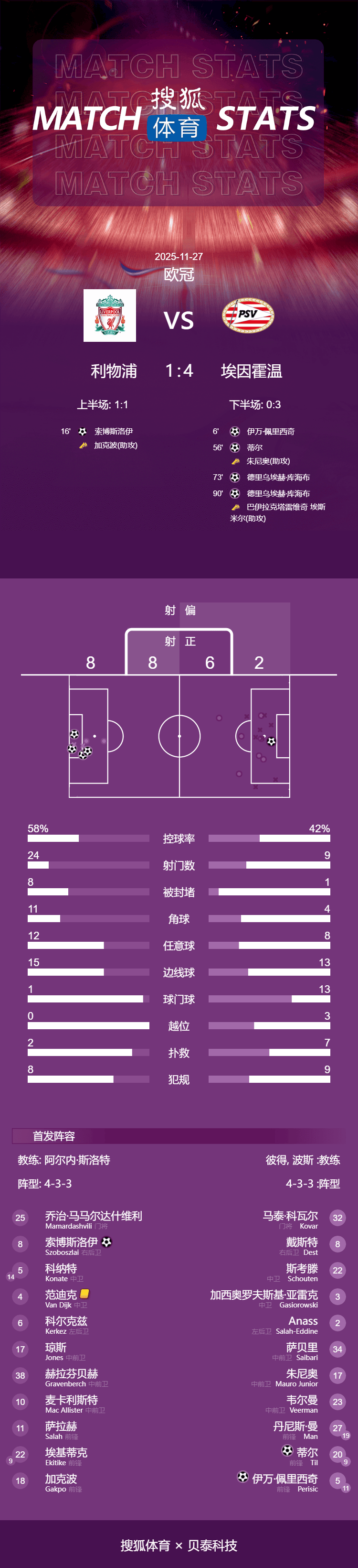 เวลา 04:00 น. ตามเวลาปักกิ่ง วันที่ 27 พฤศจิกายน การแข่งขันรอบที่ห้าของกลุ่มในยูฟ่าแชมเปียนส์ลีกฤดูกาล 2025-26 ได้เริ่มต้นขึ้น ลิเวอร์พูลพ่ายแพ้คาบ้านต่อพีเอสวี ไอน์โฮเฟน 1-4 ที่สนามแอนฟิลด์ ซึ่งเป็นการแพ้ติดต่อกันเป็นครั้งที่สามในรายการนี้เปริซิชเปิดสกอร์แรกให้กับพีเอสวีในนาทีที่ 6 โดยใช้ประโยชน์จากจุดโทษที่แวน ไดค์ทำฟาวล์ให้ทีมเสีย ซโบซไลตีเสมอให้กับลิเวอร์พูลในนาทีที่ 16 ในครึ่งหลัง เดอ ยองนำพีเอสวีขึ้นนำอีกครั้ง ก่อนที่ดรีอุคห์ตัวสำรองจะยิงประตูที่สองของตัวเองได้สำเร็จ