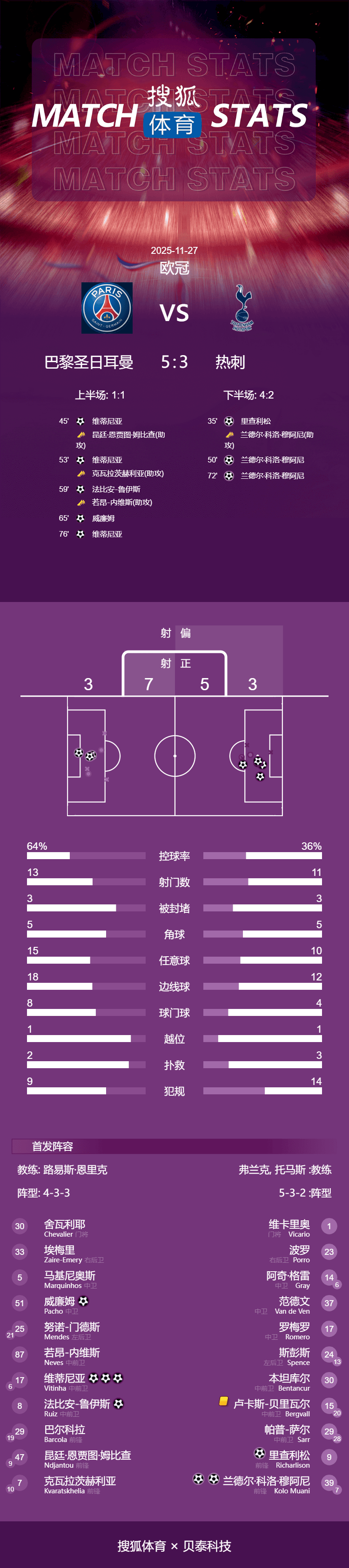 เวลา 04:00 น. ตามเวลาปักกิ่ง วันที่ 27 พฤศจิกายน การแข่งขันรอบที่ห้าของรอบแบ่งกลุ่มยูฟ่าแชมเปียนส์ลีก ฤดูกาล 2025-26 ได้เริ่มต้นขึ้น แชมป์เก่า ปารีส แซงต์-แชร์กแมง พลิกกลับมาเอาชนะ ท็อตแน่ม ฮ็อทสเปอร์ 5-3 ที่สนามปาร์กเดแพร็งส์ คว้าชัยชนะในรอบแบ่งกลุ่มเป็นนัดที่สามติดต่อกัน และไต่ขึ้นสู่อันดับสองของตารางคะแนนแชมเปียนส์ลีกโมอาเน่ช่วยริชาร์ลิซอนเปิดสกอร์แรก จากนั้นก็หันมาทำประตูให้ท็อตแน่มขึ้นนำสองครั้ง แต่วิตินญ่าก็ยิงสองประตูตีเสมอให้ทีมได้สองครั้งเช่นกัน ฟาเบียนและปาชอนยิงประตูต่อเนื่องให้ PSG ขึ้นนำอีกครั้ง โมอาเน่และวิตินญ่าต่างก็ยิงเพิ่มอีกคนละประตู ก่อนที่ลูคัสจะถูกไล่ออกในช่วงทดเวลาบาดเจ็บ