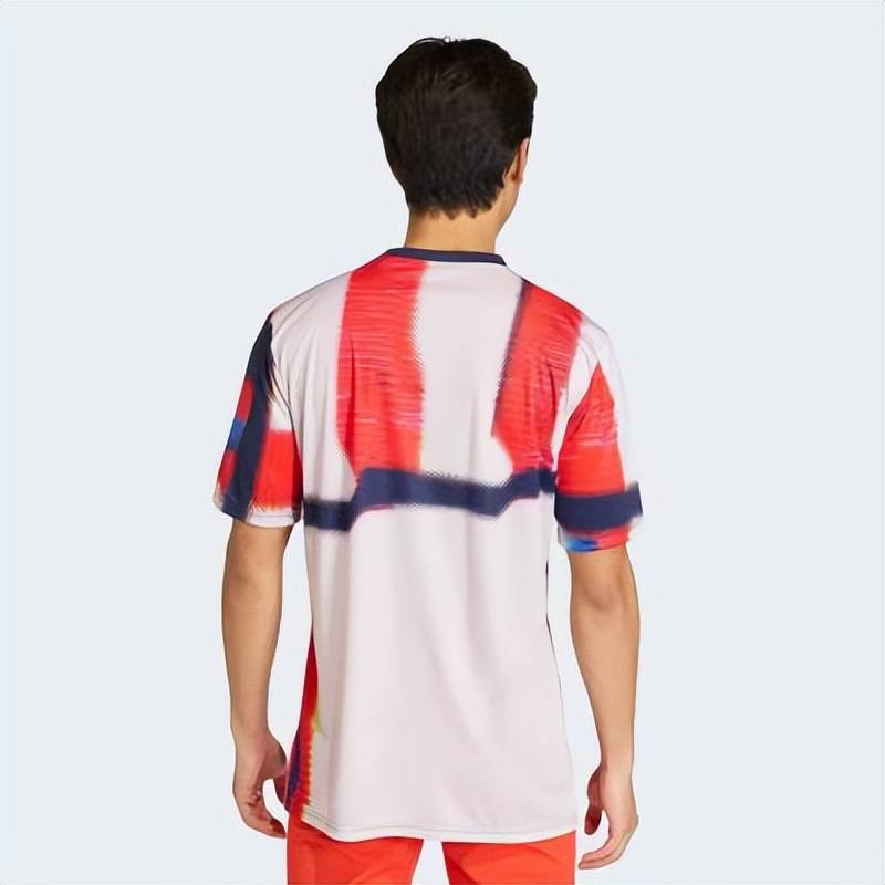ชุดซ้อมก่อนฤดูกาล 2026 ฤดูใบไม้ผลิ/ฤดูร้อน ของบาเยิร์น มิวนิก โดดเด่นด้วยลวดลายที่ได้แรงบันดาลใจจากดิจิทัลบนหน้าอกและแขนเสื้อ ดีไซน์นี้ประกอบด้วยบล็อกสีแดง สีดำหรูหรา และสีน้ำเงินสว่างสลับกันในแนวตั้งและแนวนอน บนพื้นสีชอล์กไข่มุก ด้านหลังของเสื้อใช้ลวดลายเดียวกัน ทำให้รูปแบบโดยรวมของเสื้อมีความสอดคล้องกันตลอดทั้งตัว เสื้อคอปกสีน้ำเงินเข้มช่วยเสริมให้ดีไซน์โดยรวมสมบูรณ์แบบ