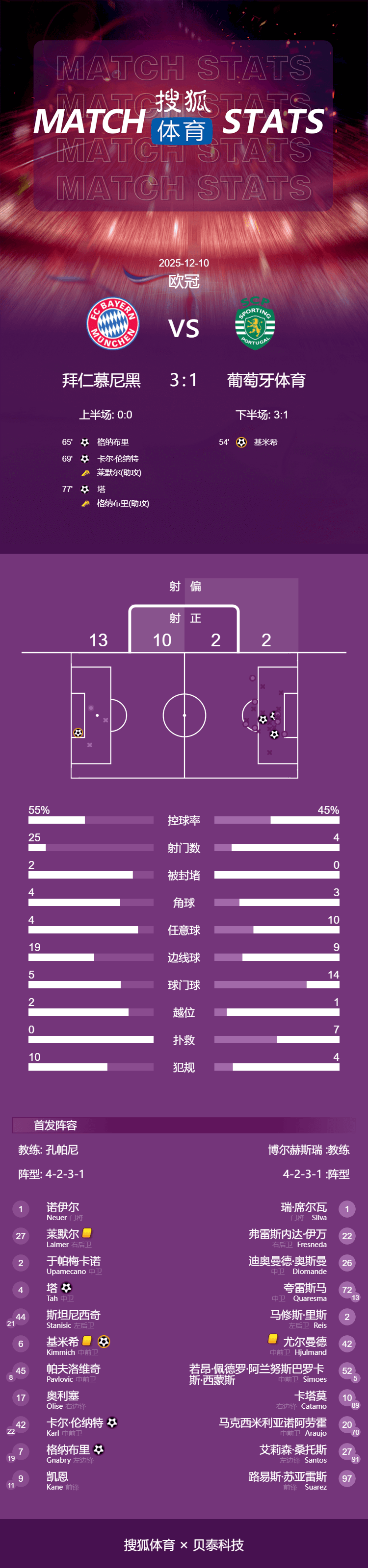 เวลา 01:45 น. ตามเวลาปักกิ่ง วันที่ 10 ธันวาคม บาเยิร์น มิวนิก เปิดบ้านรับการมาเยือนของ สปอร์ติง ซีพี ในนัดที่ 6 ของรอบแบ่งกลุ่ม ฤดูกาล 2025-26 ยูฟ่า แชมเปียนส์ลีก ครึ่งแรก คิมมิช ทำประตูให้ทีมขึ้นนำ แต่ประตูถูกยกเลิกเนื่องจากล้ำหน้า ทำให้ทั้งสองทีมเสมอกัน 0-0 ในครึ่งแรกในครึ่งหลัง โจชัว คิมมิช ทำเข้าประตูตัวเอง แต่เซิร์จ นาบรีย์ และคาร์ล รีบทำประตูตอบโต้เพื่อพลิกสถานการณ์ คาร์ล วัย 17 ปี ทำประตูได้สามครั้งในสี่นัดล่าสุดในแชมเปียนส์ลีก โจนาธาน ทาห์ ปิดท้ายชัยชนะ ขณะที่อัลฟอนโซ เดวีส์ ลงสนามเป็นตัวสำรอง กลับมาลงสนามอีกครั้งหลังจากหายไป 262 วัน บาเยิร์นชนะในบ้าน 3-1 เหนือสปอร์ติง ซีพี