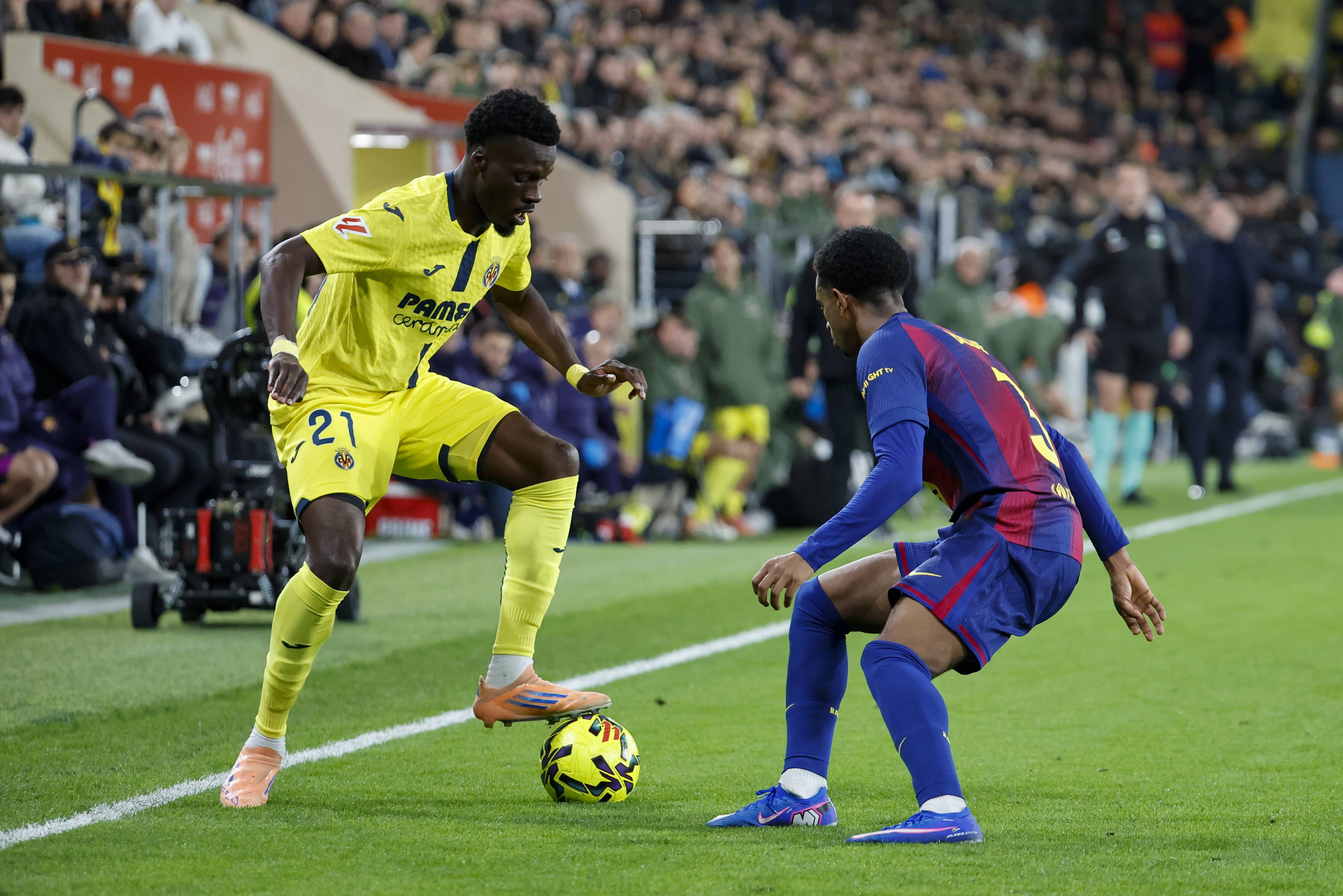 เมื่อวันที่ 21 ธันวาคม อุสมาน เดมเบเล่ ของบาร์เซโลนา (ขวา) ท้าทาย โอลูวาเซอี ของบียาร์เรอัล ซินหัว/อีพีเอ