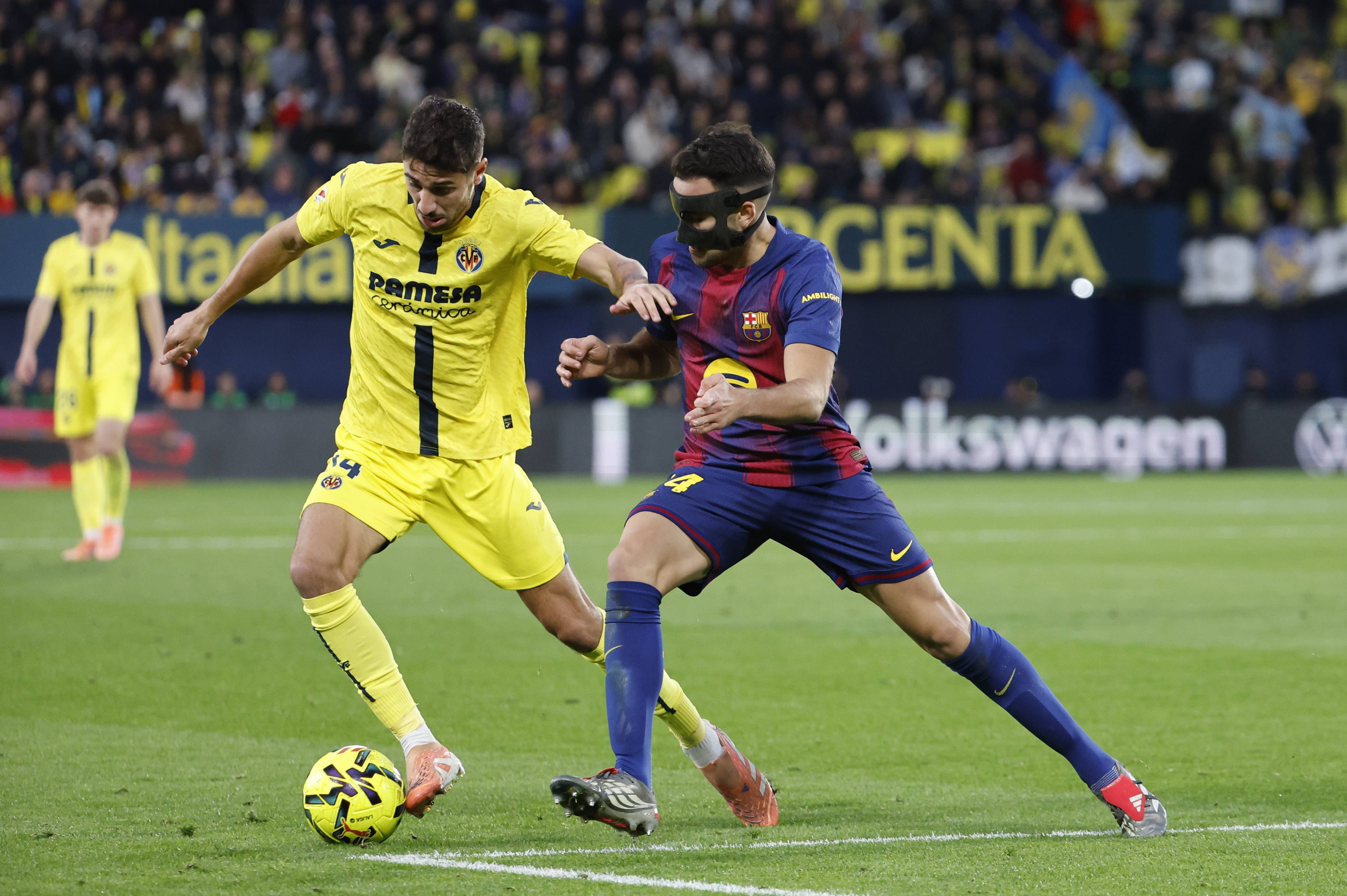 เมื่อวันที่ 21 ธันวาคม โลเปซ (ซ้าย) ของบาร์เซโลนาท้าทายโมเรโร่ของบียาร์เรอัลเพื่อแย่งบอล. ชินหัว/อีพีเอ