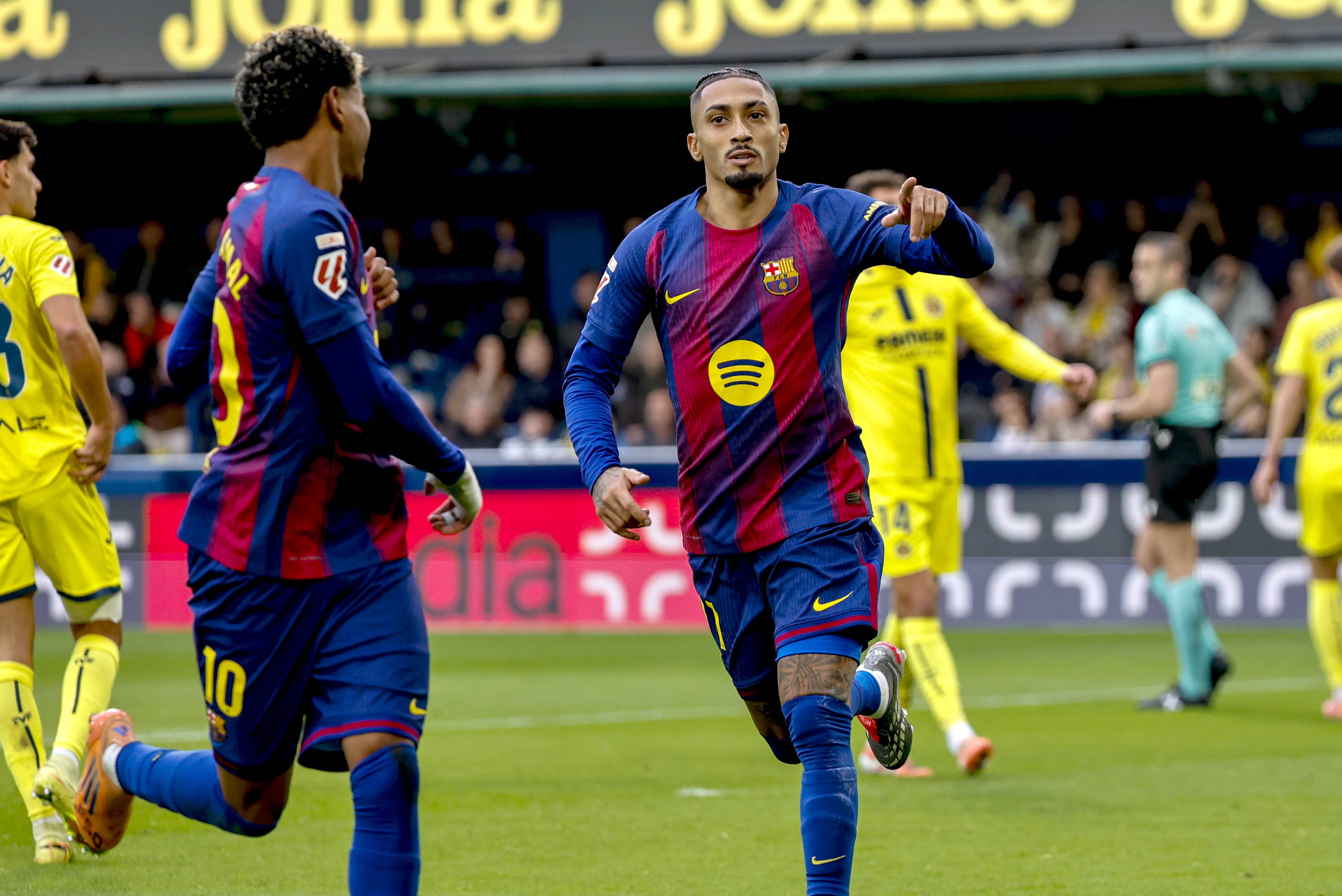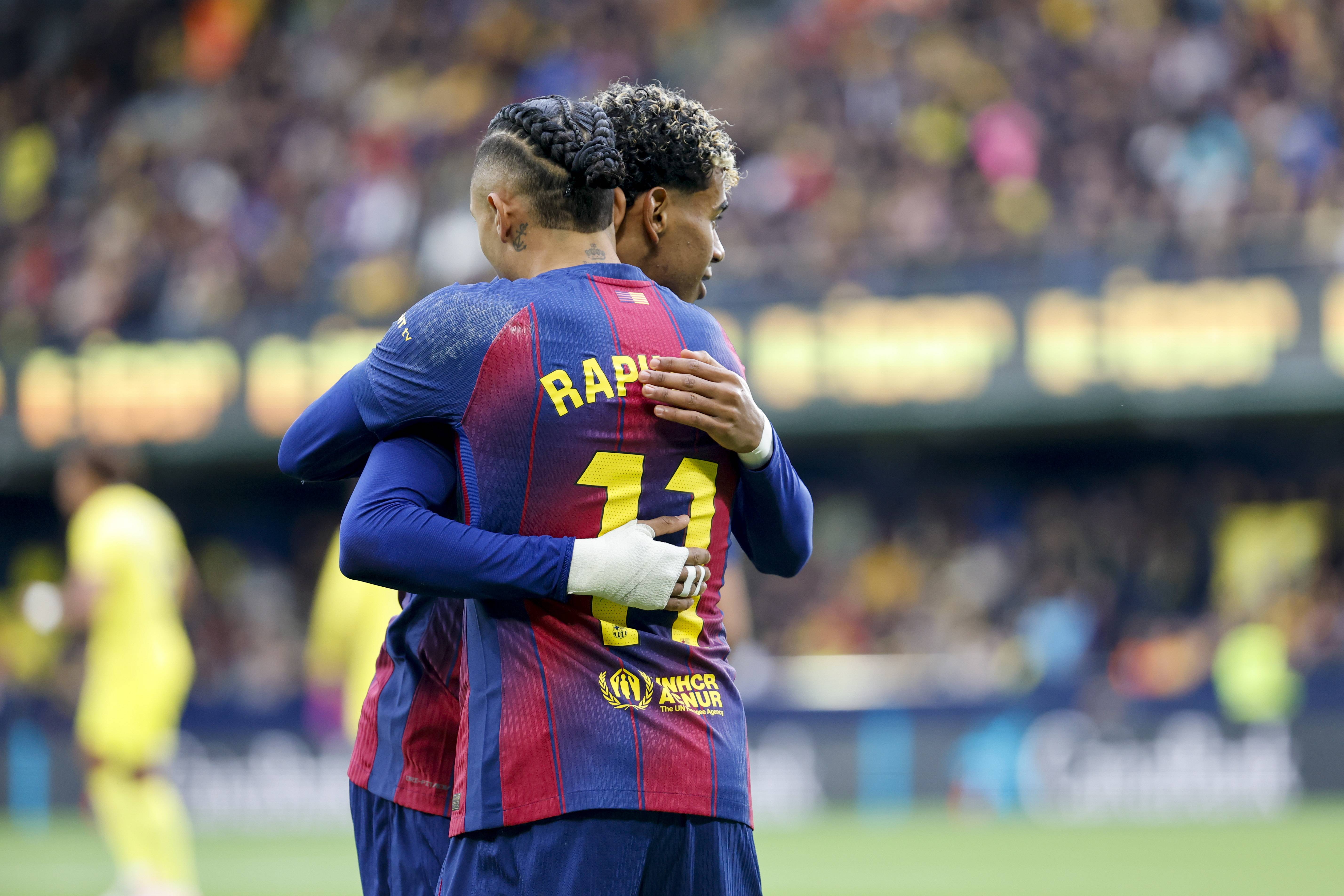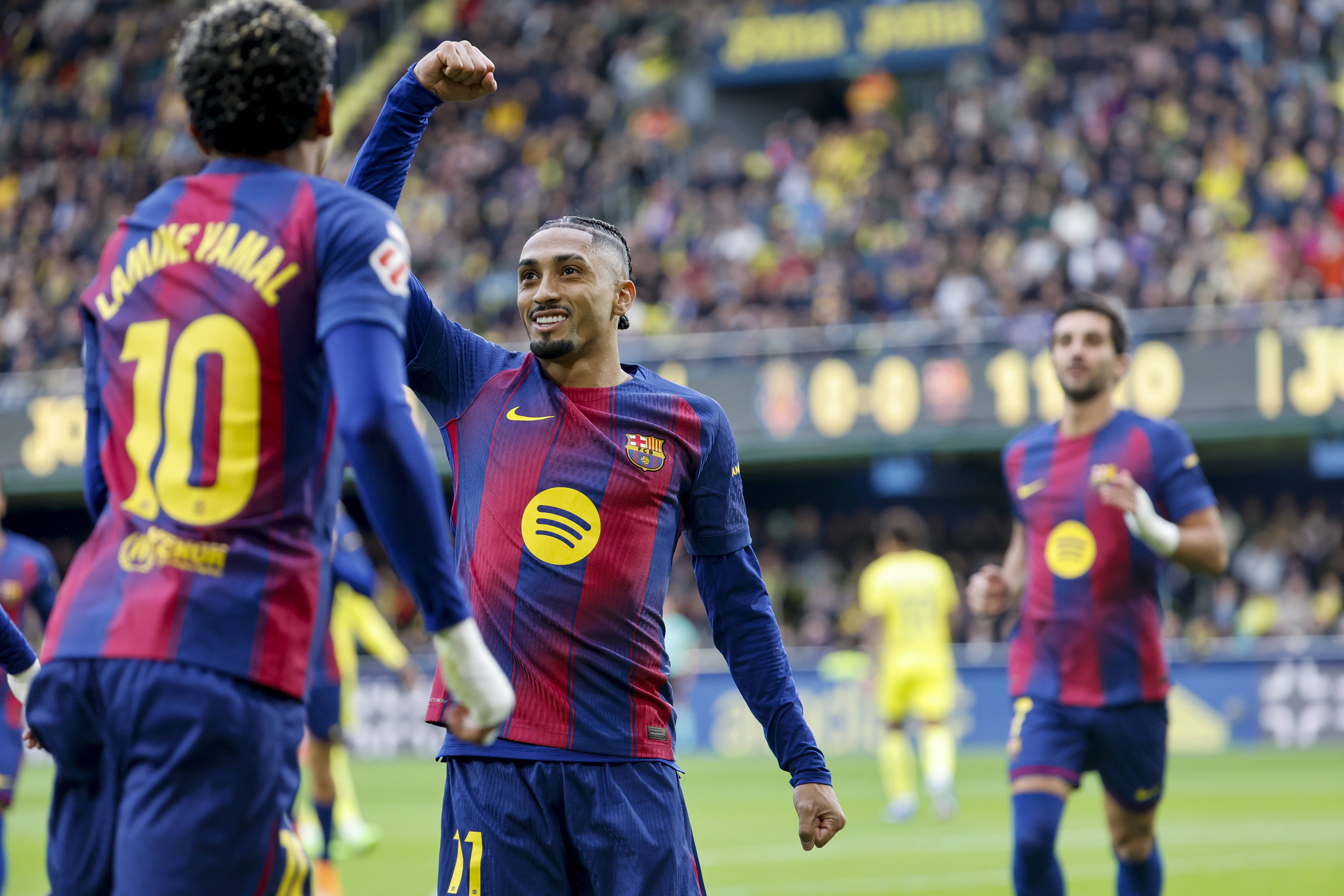 เมื่อวันที่ 21 ธันวาคม ราฟินญ่า นักเตะบาร์เซโลนา (ขวา) ฉลองกับเพื่อนร่วมทีม ยามาล หลังจากทำประตูเปิดให้กับทีม ซินหัว/EPA