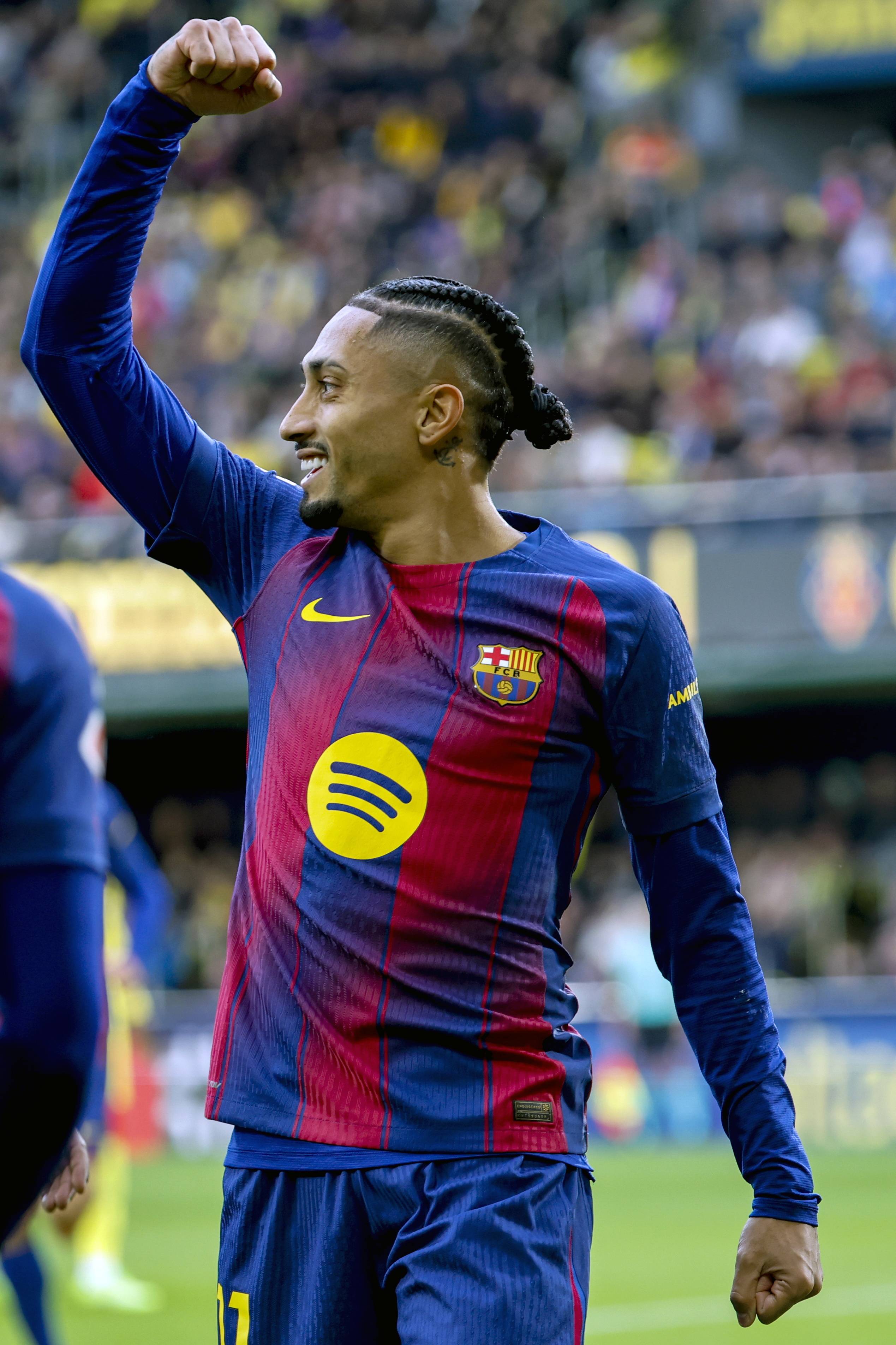 เมื่อวันที่ 21 ธันวาคม ราฟินญ่า นักเตะบาร์เซโลนา (กลาง) ฉลองการทำประตูเปิดให้กับทีมของเขา สำนักข่าวซินหัว/EPA